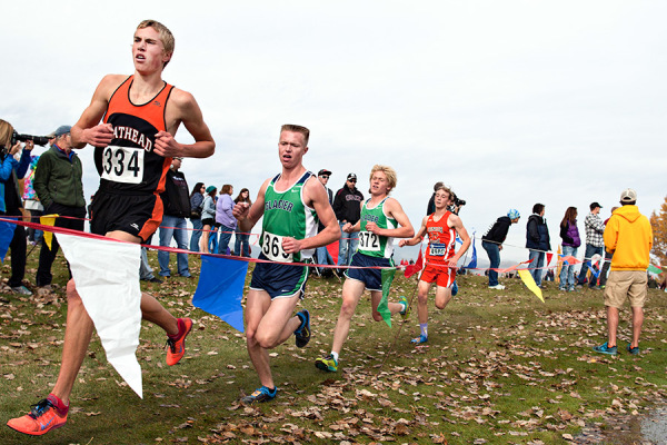 Flathead’s Sylas Schutt leads Glacier’s Logan Harmon and Brock Sandry. The MHSA cross country championships at Bill Roberts Golf Course in Helena on Oct. 25, 2014. Greg Lindstrom | Flathead Beacon