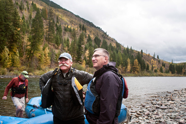 Chris Ruffatto, left, chats with Sen. John Walsh before floating down the North Fork Flathead River on Sept. 26, 2014. Greg Lindstrom | Flathead Beacon