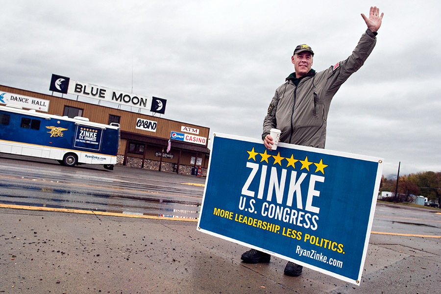 Republican U.S. House candidate Ryan Zinke waves to supporters in Columbia Falls on Nov. 4, 2014. Greg Lindstrom | Flathead Beacon