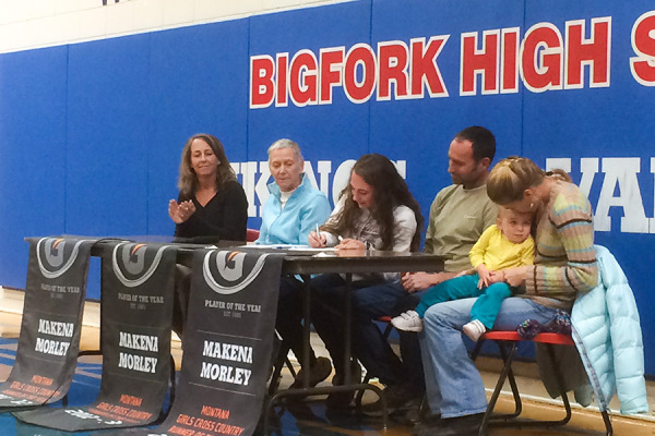 Makena Morley, center, signs a National Letter of Intent on Nov. 12 to compete at the University of Montana next year. Dillon Tabish | Flathead Beacon