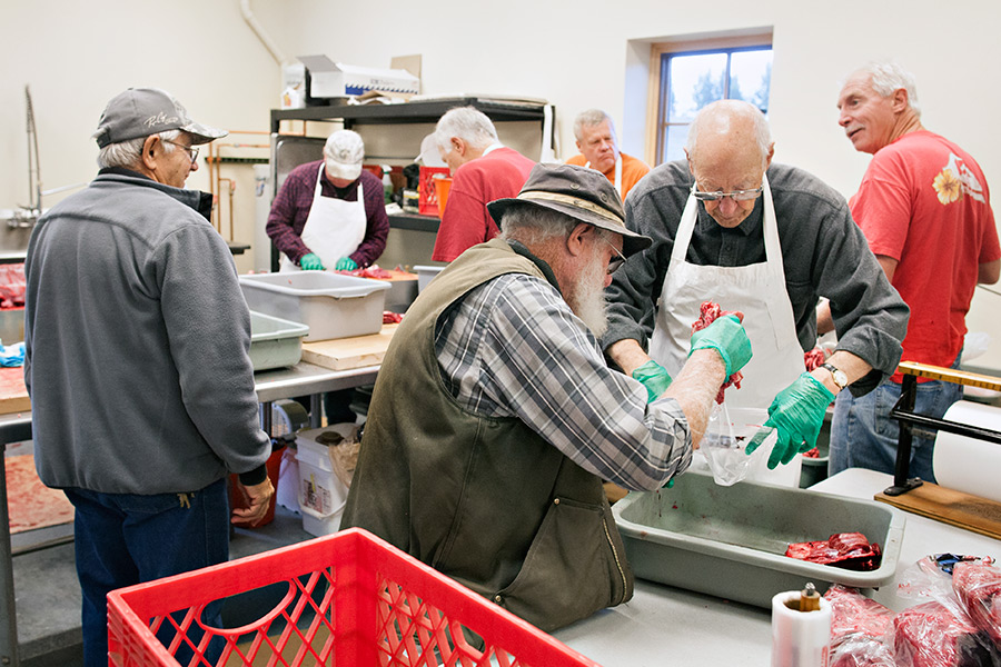 Bob Look, right, and Vance Conn package game as others butcher meat at North Valley Food Bank in Whitefish on Nov. 7, 2014. Greg Lindstrom | Flathead Beacon