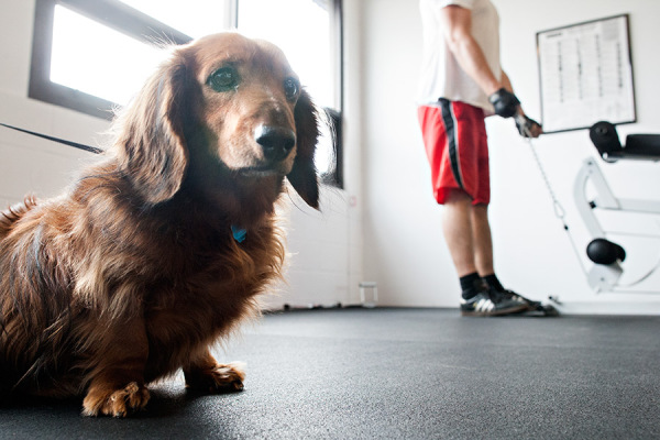 Misia, a long-haired Dachshunds, rests while her owner, Stan Rog, works out at the Walk Your Dog Club in Kalispell on Nov. 6, 2014. Greg Lindstrom | Flathead Beacon