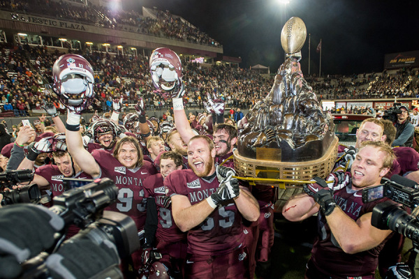 Griz players hoist the Great Divide Trophy after defeating Montana State 34-7 last Saturday in Washington-Grizzly Stadium. Todd Goodrich photo | University of Montana