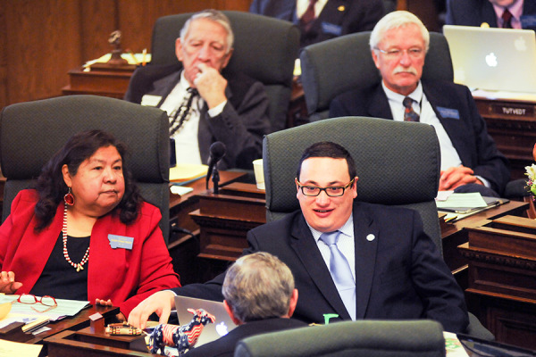 State Sen. Shannon Augare is seen at his desk in the Senate Chamber during the 63rd Legislative Assembly in Helena. Beacon File Photo