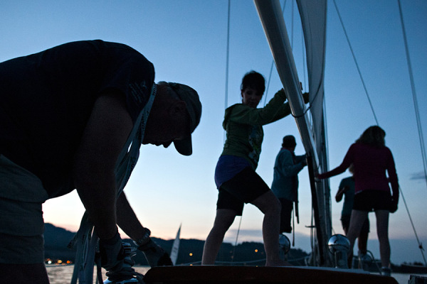 Jim Kelley, left, and other members of the crew of the J-Walker put up the sails after the Tuesday night race league with the North Flathead Yacht Club on July 15, 2014. Greg Lindstrom | Flathead Beacon