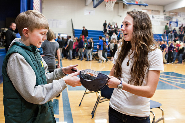 Makena Morley autographs a young fan’s hat after a school-wide assembly in Bigfork on Jan. 12, 2015. Greg Lindstrom | Flathead Beacon
