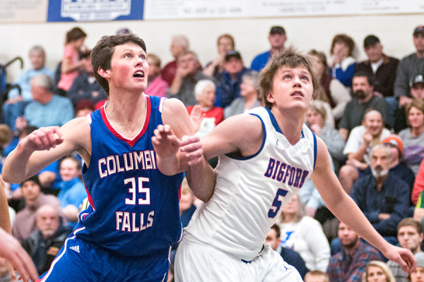Grant Wallace (35) battles Bigfork’s Tyler Piazzola for a rebound. Columbia Falls beat Bigfork 64-43 on Jan. 8, 2015. Greg Lindstrom | Flathead Beacon