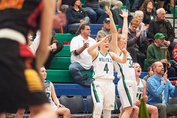 Hailee Bennett (4) and Tessa Krueger (32) celebrates a Glacier basket in the second half. The Wolfpack rolled past Missoula Hellgate 57-30 in Kalispell on March 5, 2015, advancing to the Class AA state tournament for the fourth season in a row. For more photos visit www.flatheadbeacon.com. Greg Lindstrom | Flathead Beacon