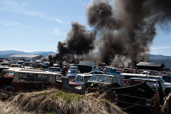 Firefighters from across the Flathead Valley respond to the massive fire at A1 Auto Enterprises near Somers on April 17, 2015. Greg Lindstrom | Flathead Beacon