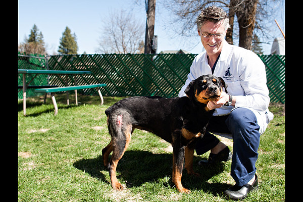 Whitefish Animal Hospital By Greg Lindstrom April 17, 2015 Jim Thompson pets Phoenix at Whitefish Animal Hospital on April 16, 2015. Greg Lindstrom | Flathead Beacon