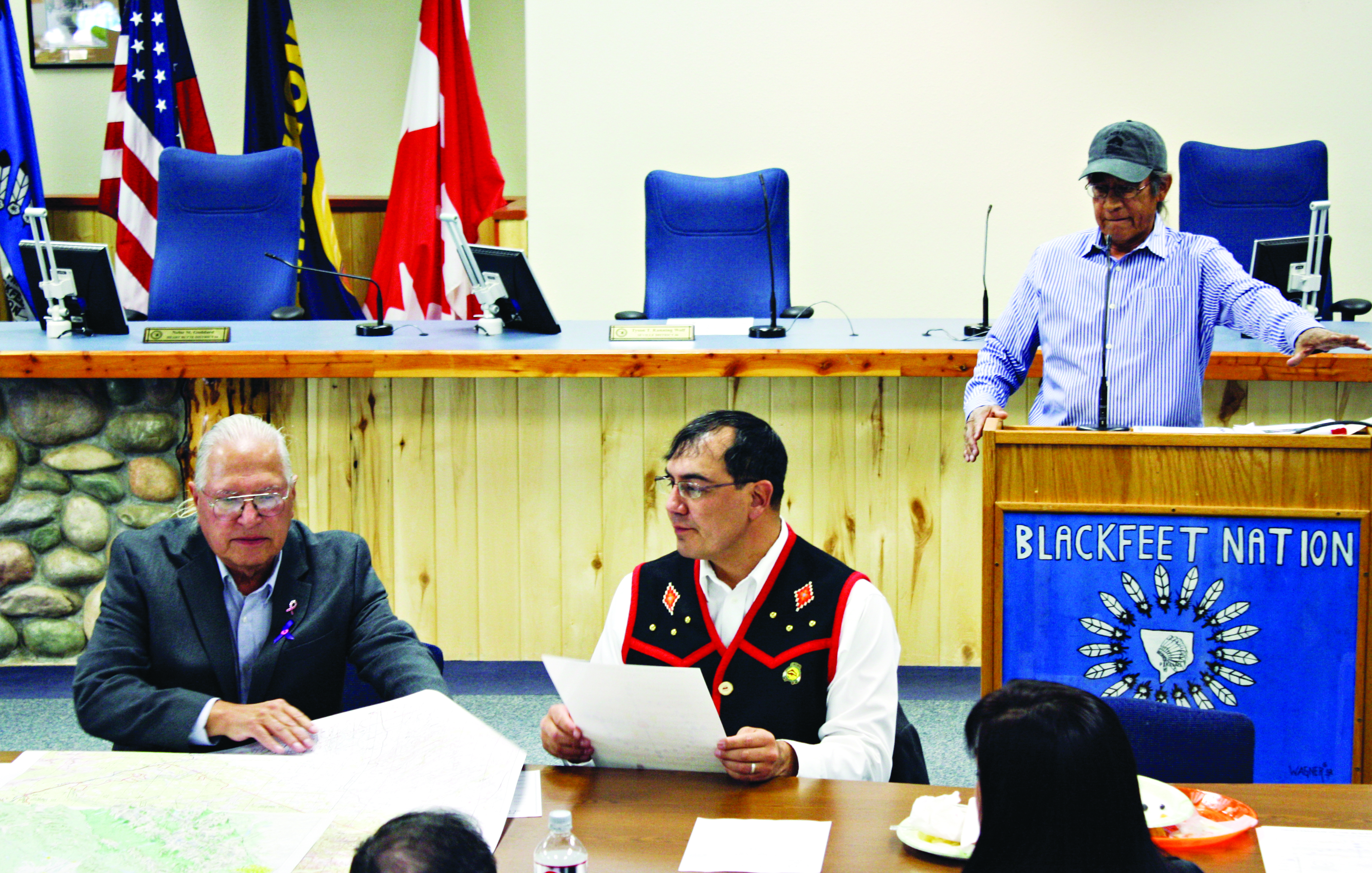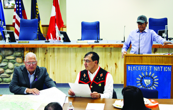 Harry Barnes, left, chairman of the Blackfeet Tribal Business Council, views a map of the Badger-Two Medicine area while Tribal Historic Preservation Officer John Murray, standing, discusses the cultural significance of the area during a meeting last year. Beacon File Photo