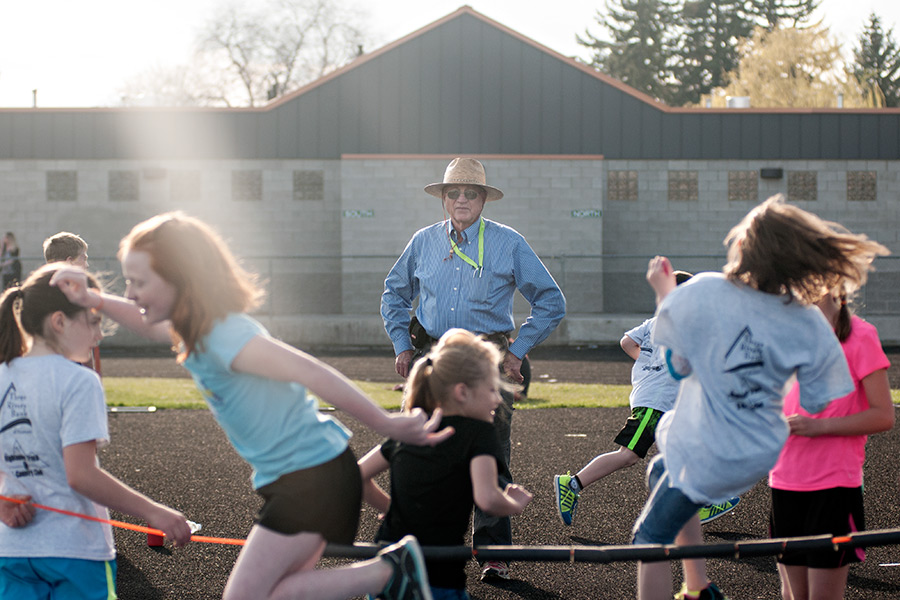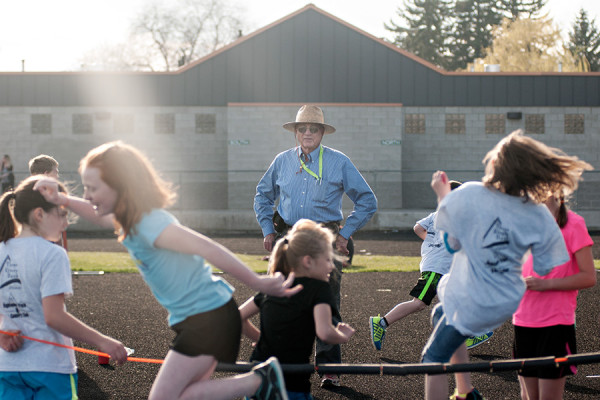 Lew Savik watches as children work on high jump techniques at Highlander track practice on April 21, 2015. Greg Lindstrom | Flathead Beacon