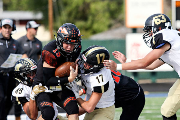 Jaden MacNeil (15) is brought down by Billings West defenders. Billings West defeated Flathead 42-20 at Legends Stadium on Sept. 7, 2018. Greg Lindstrom | Flathead Beacon