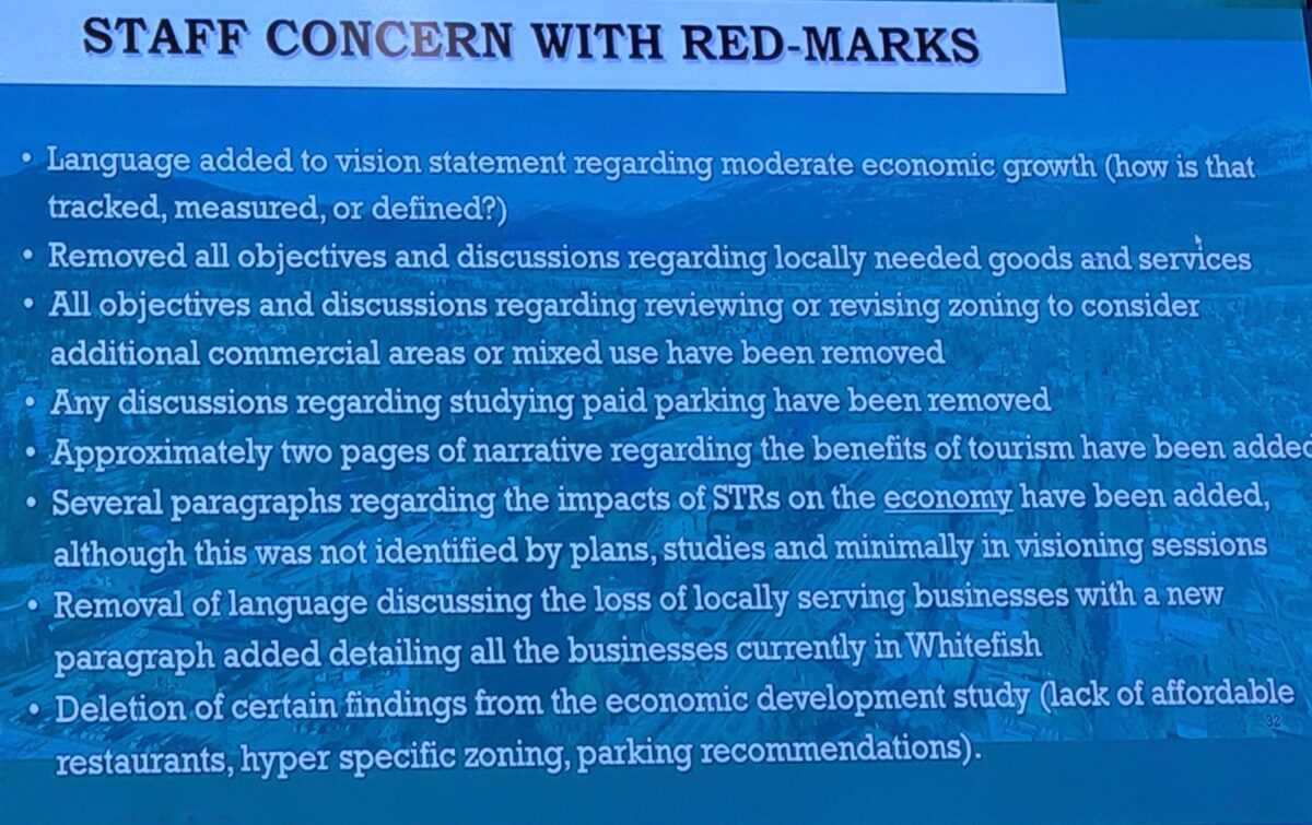 The eight concerns with the planning commission’s edits to the chapter highlighted by staff included: removal of all objectives and discussions regarding locally needed goods and services; removal of all objectives and discussions regarding reviewing or revising zoning to consider additional commercial areas or mixed use; and removal of language discussing the loss of locally serving businesses with a new paragraph detailing all the businesses currently in Whitefish.