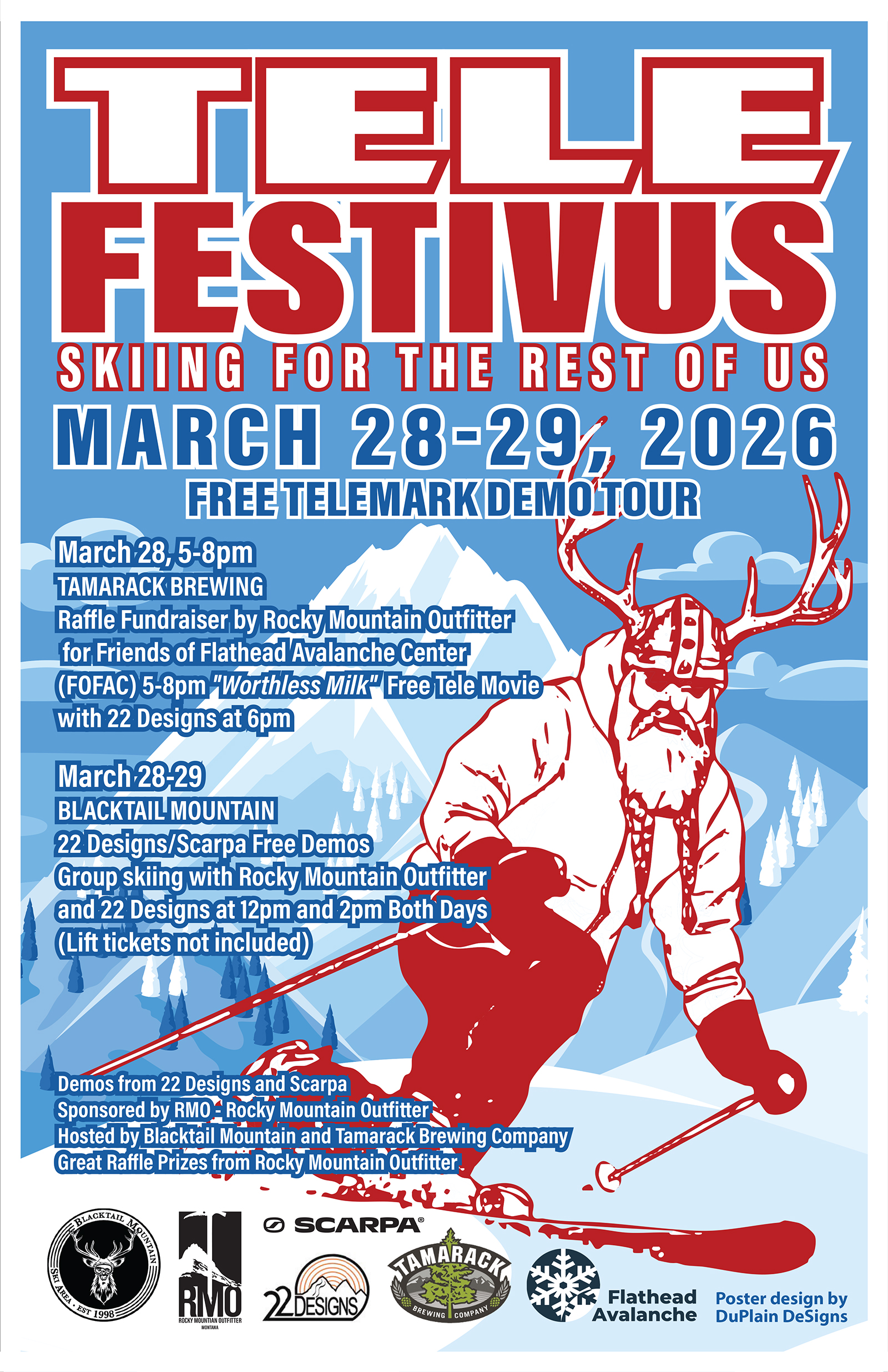 The TeleFestivus takes place March 28-29 at Blacktail Mountain Ski Area in Lakeside, with 22 Designs and Scarpa offering free demos and RMO providing group ski tours. The two-day event also features a raffle fundraiser and film showing from 5 p.m. to 8 p.m. on March 28 at Tamarack Brewing Company in Lakeside to support the nonprofit Friends of the Flathead Avalanche Center. At 6 p.m. on March 28, representatives of 22 Designs will show “Worthless Milk.” Attendance is free of charge.