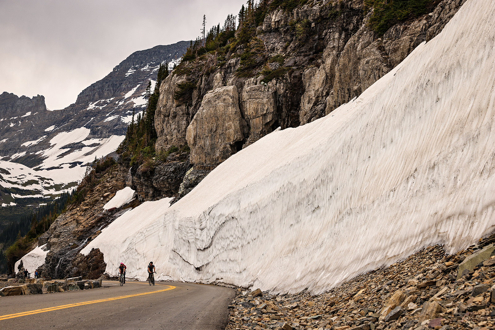 From April to June, bikers enjoy glacier views, dripping waterfalls, and the peace of early spring from the Sun Road before the road opens to vehicles