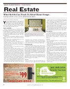 • Showcase objects and art that have layers of interest or meaningful stories. For example, a large, bright red work of abstract art near the hotel’s front desk is com- prised entirely of buttons, but you can’t see the but- tons until you get close. The button art was inspired by the hotel’s neighborhood: It’s in Manhattan’s Gar- ment District, and many of its design elements are connected to the apparel and fashion industries, from little ceramic sewing machine decorations in guest rooms, to quotes from famous designers placed on cof- fee tables in the club lounge. Another large artwork