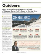 Opening the Sun Road to vehicle traf- c is an accomplishment that draws a signi cant amount of interest because of its impact on the region’s tourism sea- son, which erupts when the road opens to Logan Pass Visitor Center. Record crowds are expected yet again this year as the NPS celebrates its centennial and Glacier Park’s popularity reaches an all-time high; the park has broken annual visitation records two years in a row.