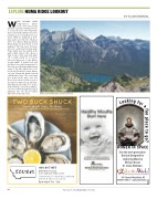 WITH RECENT HIGH temperatures, hikers need a few extra tricks up their moisture-wicking sleeves to escape the heat. Choosing a hike that reaches high altitudes is a given, but my new go-to is finding one near water. With its trailhead at Bow- man Lake and objective sitting at 6,900 feet, Glacier National Park’s Numa Ridge Lookout Trail is well qualified. The trip starts off along- side the easygoing Bowman Lake Trail, which runs the length of the park’s third largest lake. About a mile in, the 5-mile long trail splits off to climb gently for 2.5 miles before hooking east to take hikers steeply uphill. It winds back and forth across a south-facing aspect of the ridge, providing mouthwatering views of the lake, which lies 3,000 feet below. From the lookout, hikers can ogle behemoths Rainbow Peak and Mount Carter. The next high spot north in the ridge, 800 feet above the lookout, obscures view of the immense Numa Peak, and bush- whacking up the ridge for a look is well worth the extra sweat. Which, of course, will wash right away upon plunging into the glacier-chilled lake water at the day’s end.