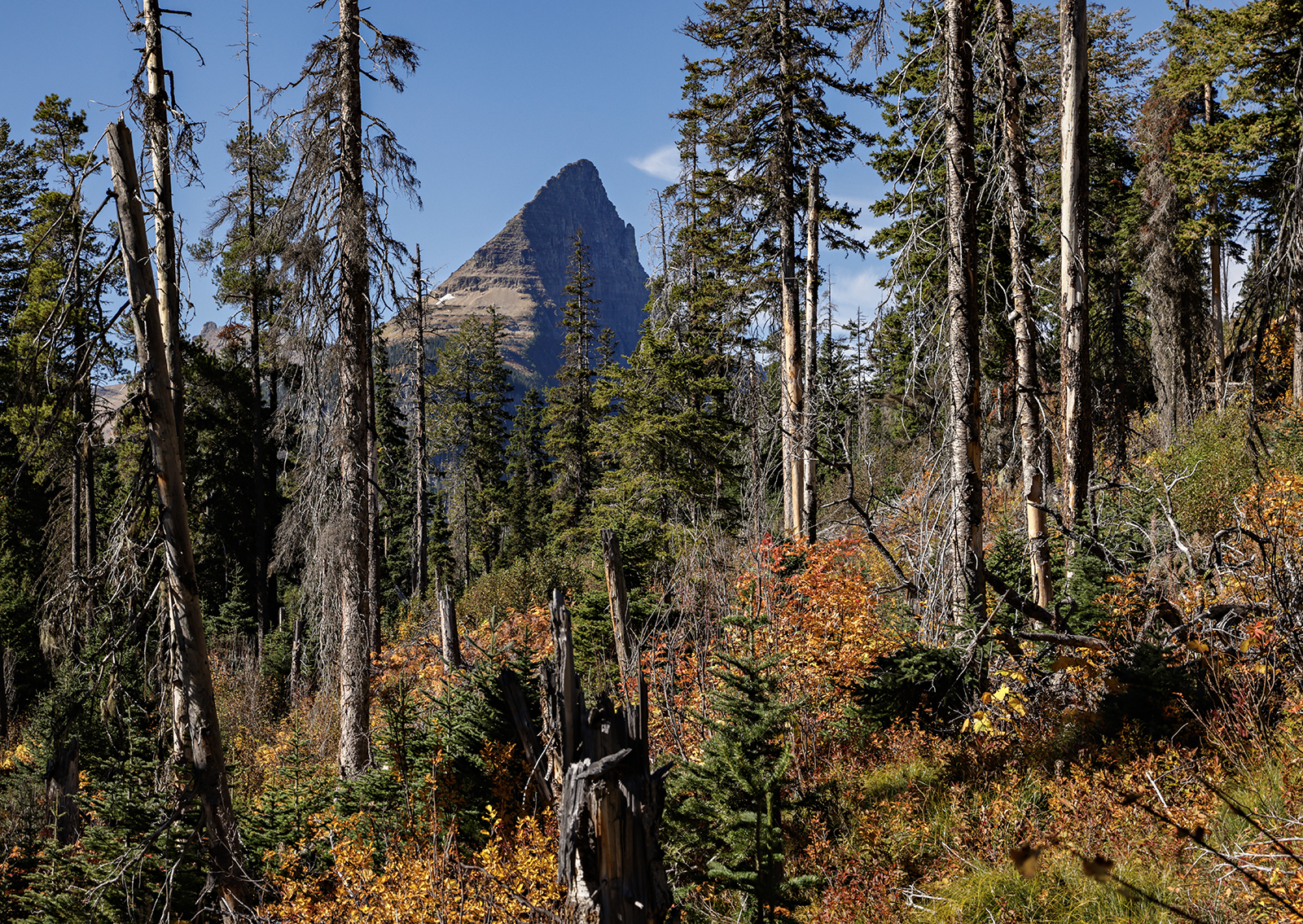 Fusillade Mountain pokes out through fall foliage in Glacier National Park on Sept. 28, 2024. Hunter D’Antuono | Flathead Beacon