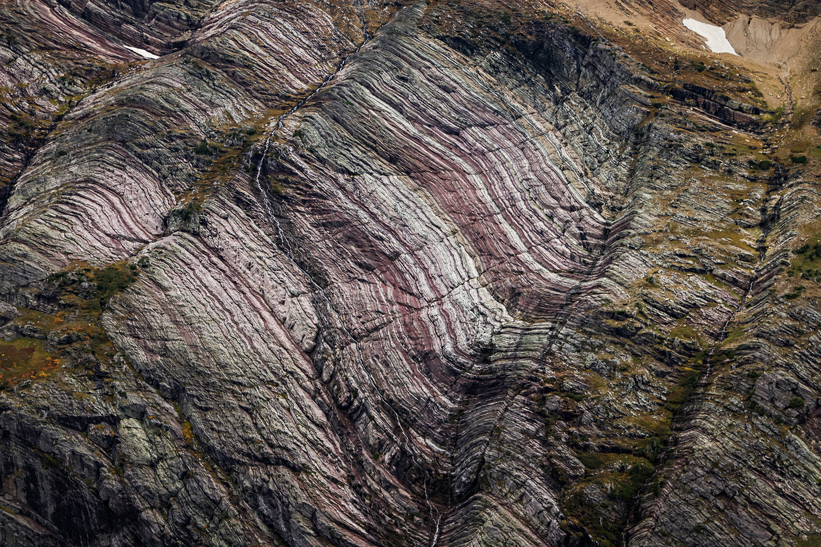 A waterfall in a striated cliff face over Gunsight Lake in Glacier National Park on Sept. 29, 2024. Hunter D’Antuono | Flathead Beacon