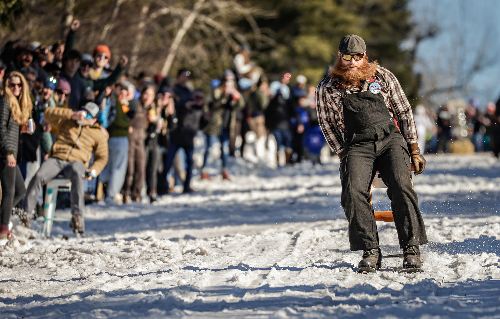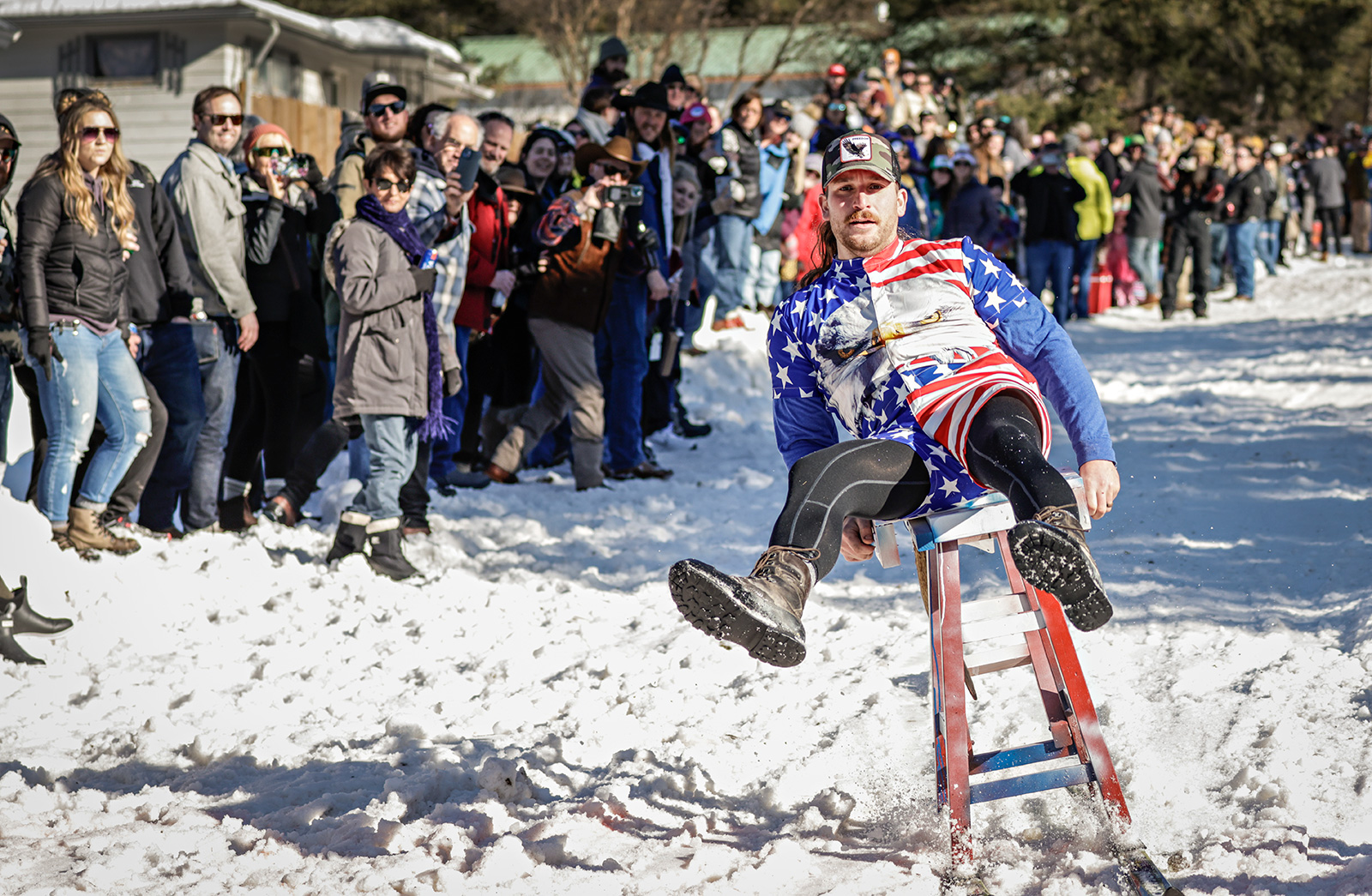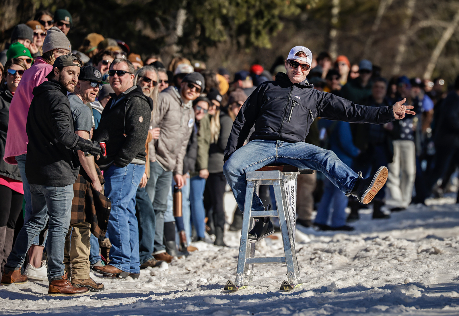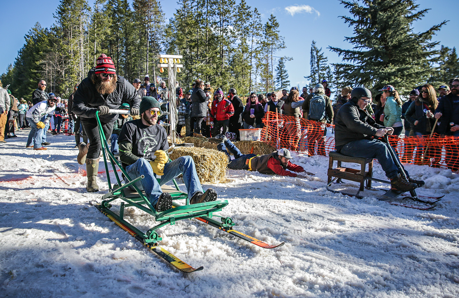 Beverage-toting throngs packed the slopes of Sugar Hill in Martin City to watch the 44th annual Cabin Fever Days Bar Stool Ski Races on Feb. 11, 2023.. Hunter D'Antuono | Flathead Beacon