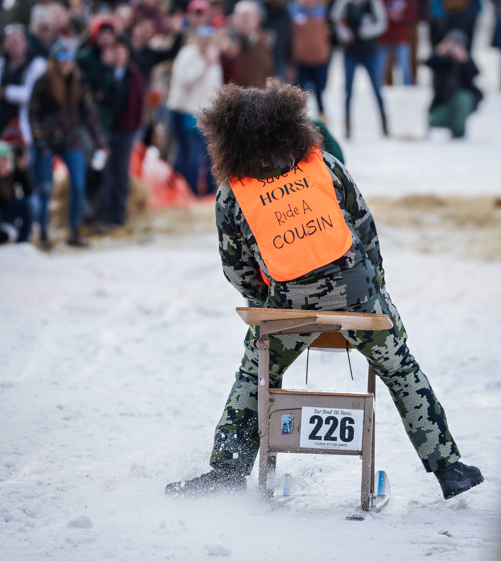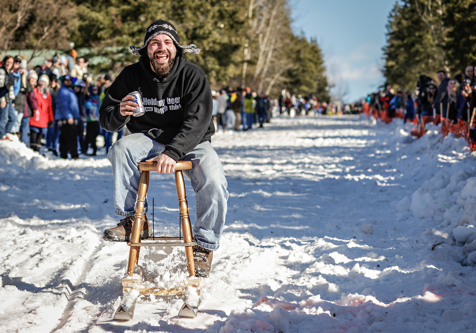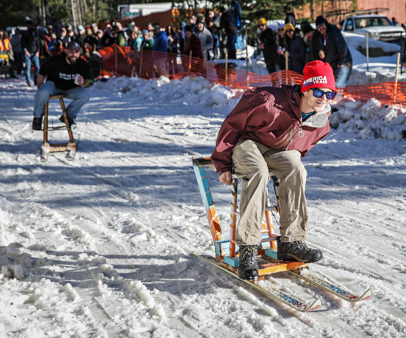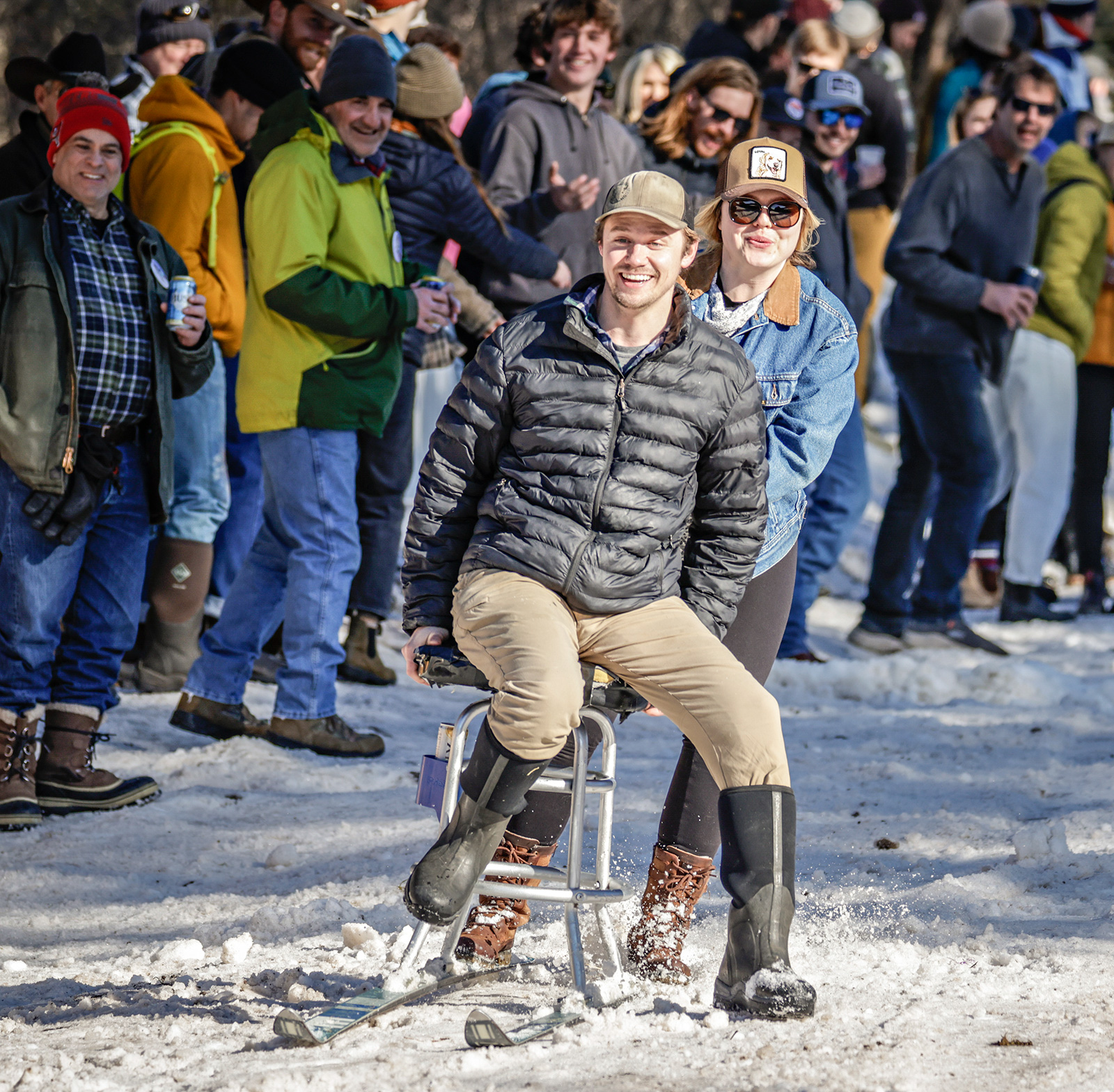 Beverage-toting throngs packed the slopes of Sugar Hill in Martin City to watch the 44th annual Cabin Fever Days Bar Stool Ski Races on Feb. 11, 2023.. Hunter D'Antuono | Flathead Beacon