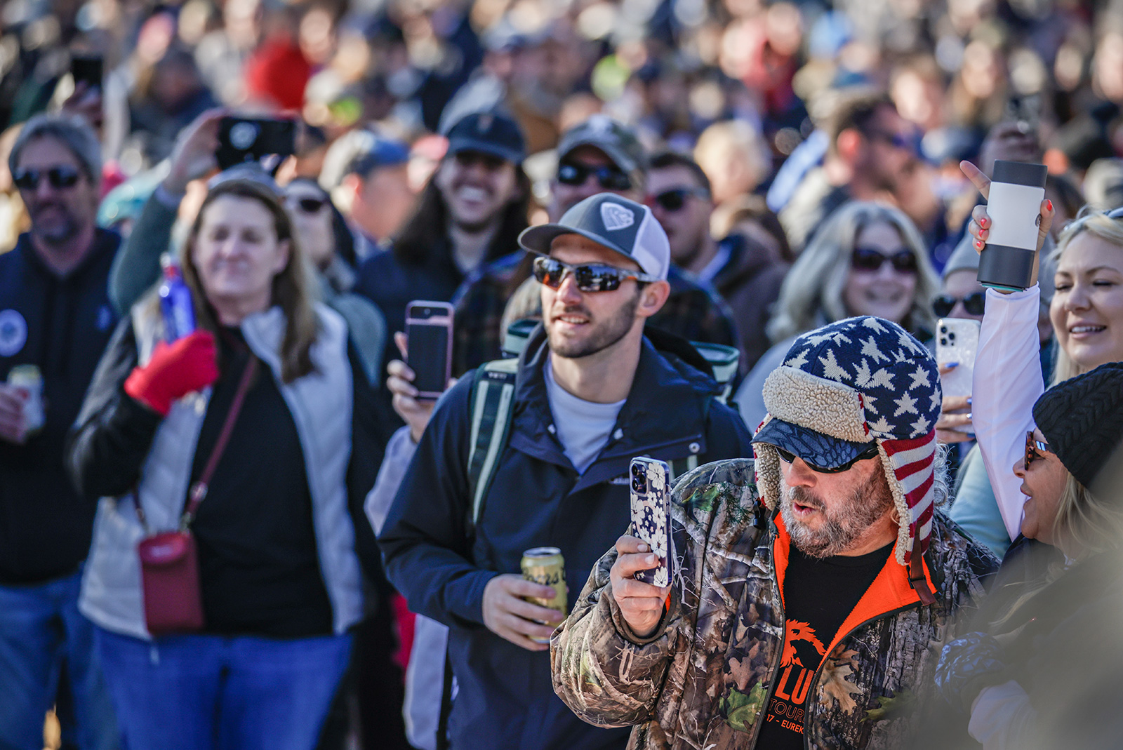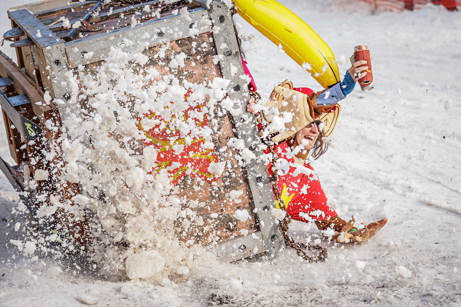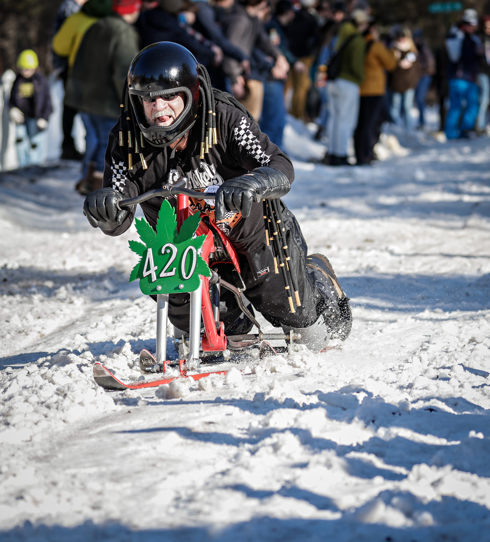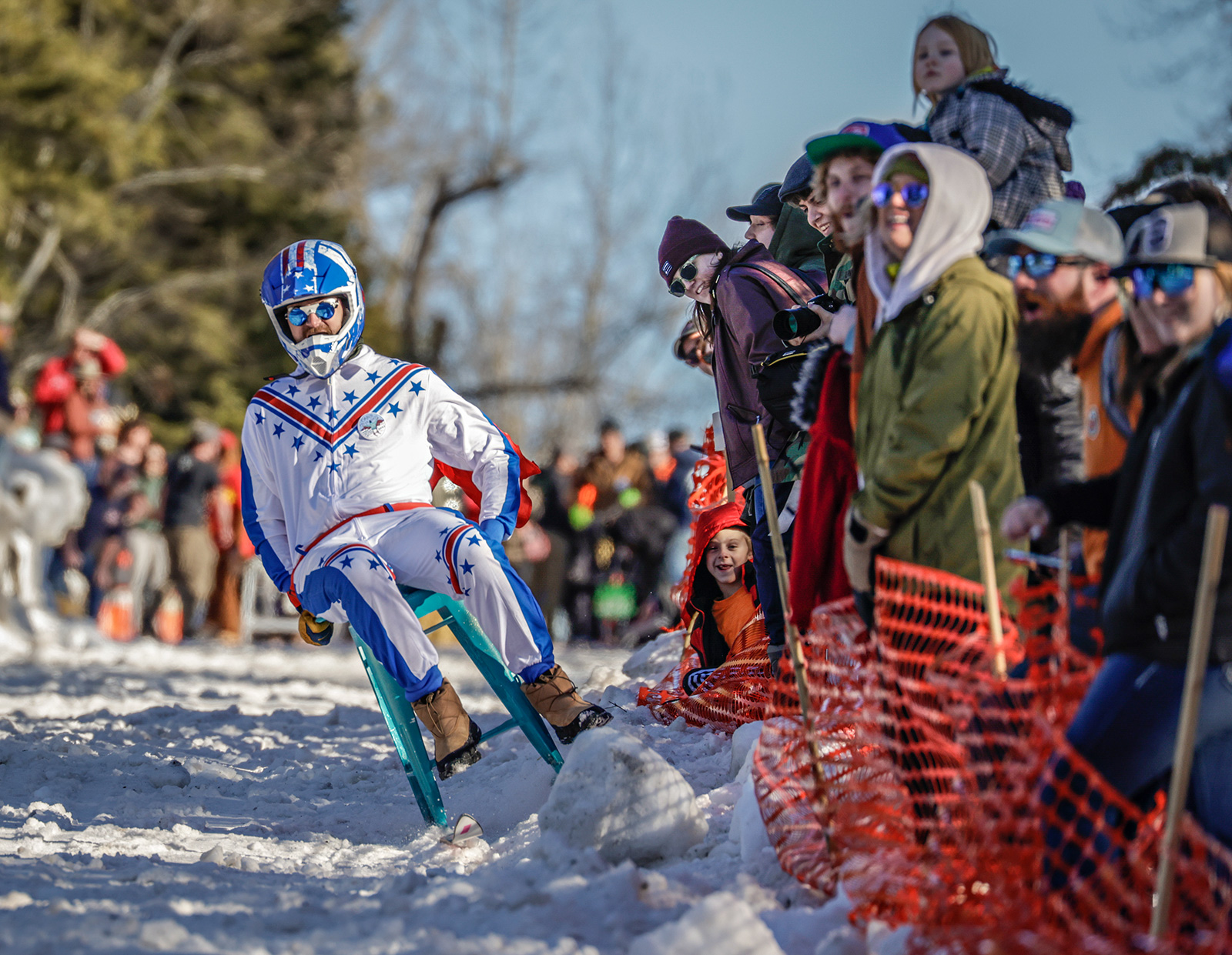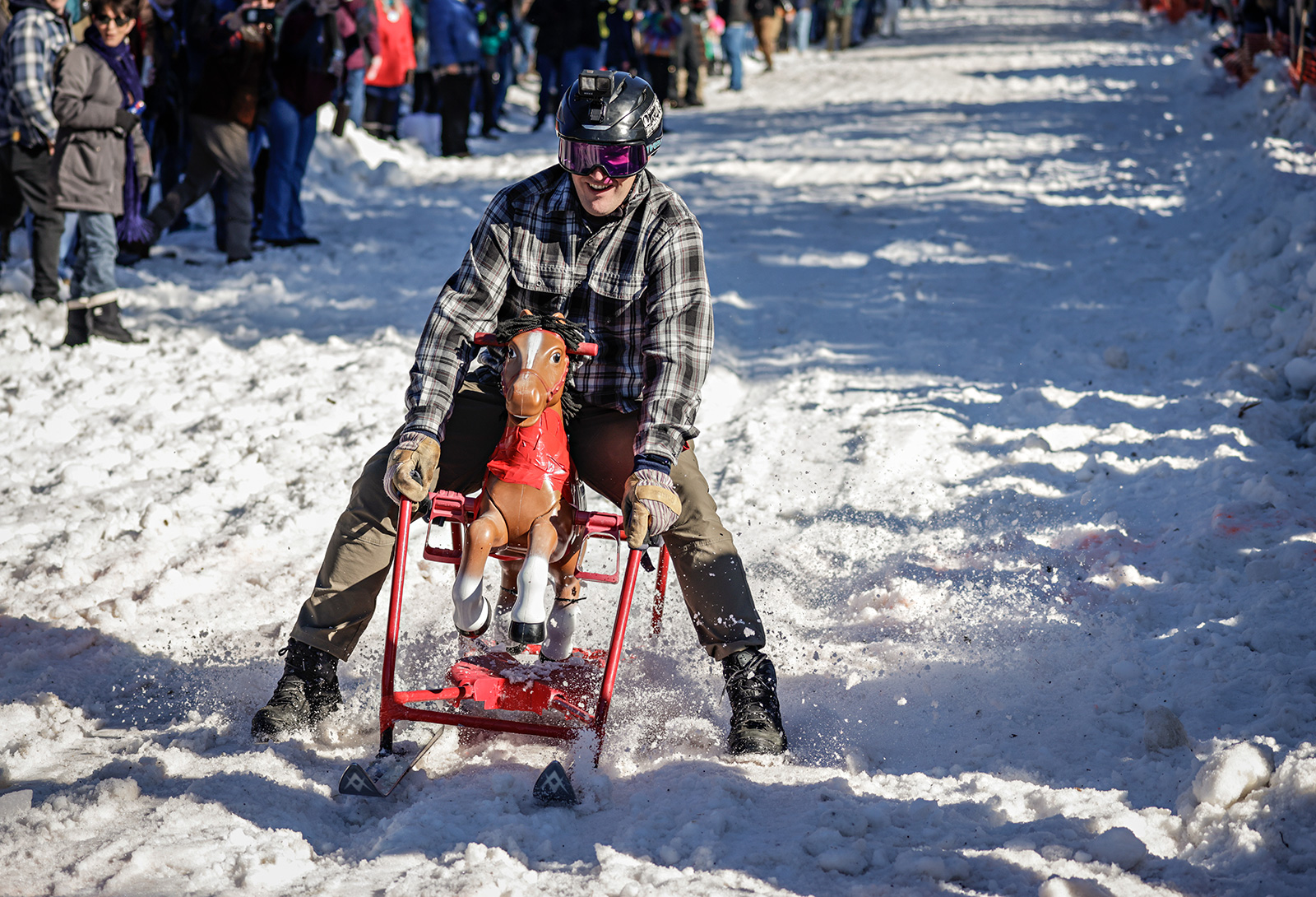 Beverage-toting throngs packed the slopes of Sugar Hill in Martin City to watch the 44th annual Cabin Fever Days Bar Stool Ski Races on Feb. 11, 2023.. Hunter D'Antuono | Flathead Beacon