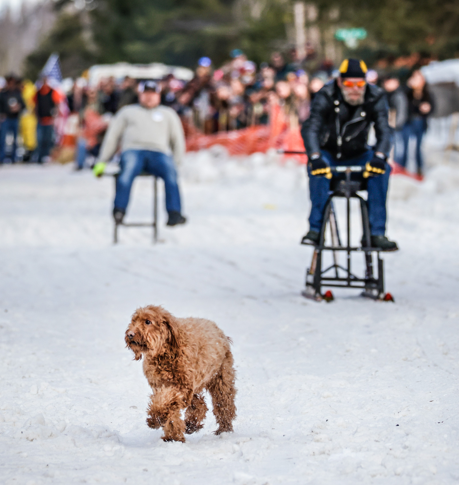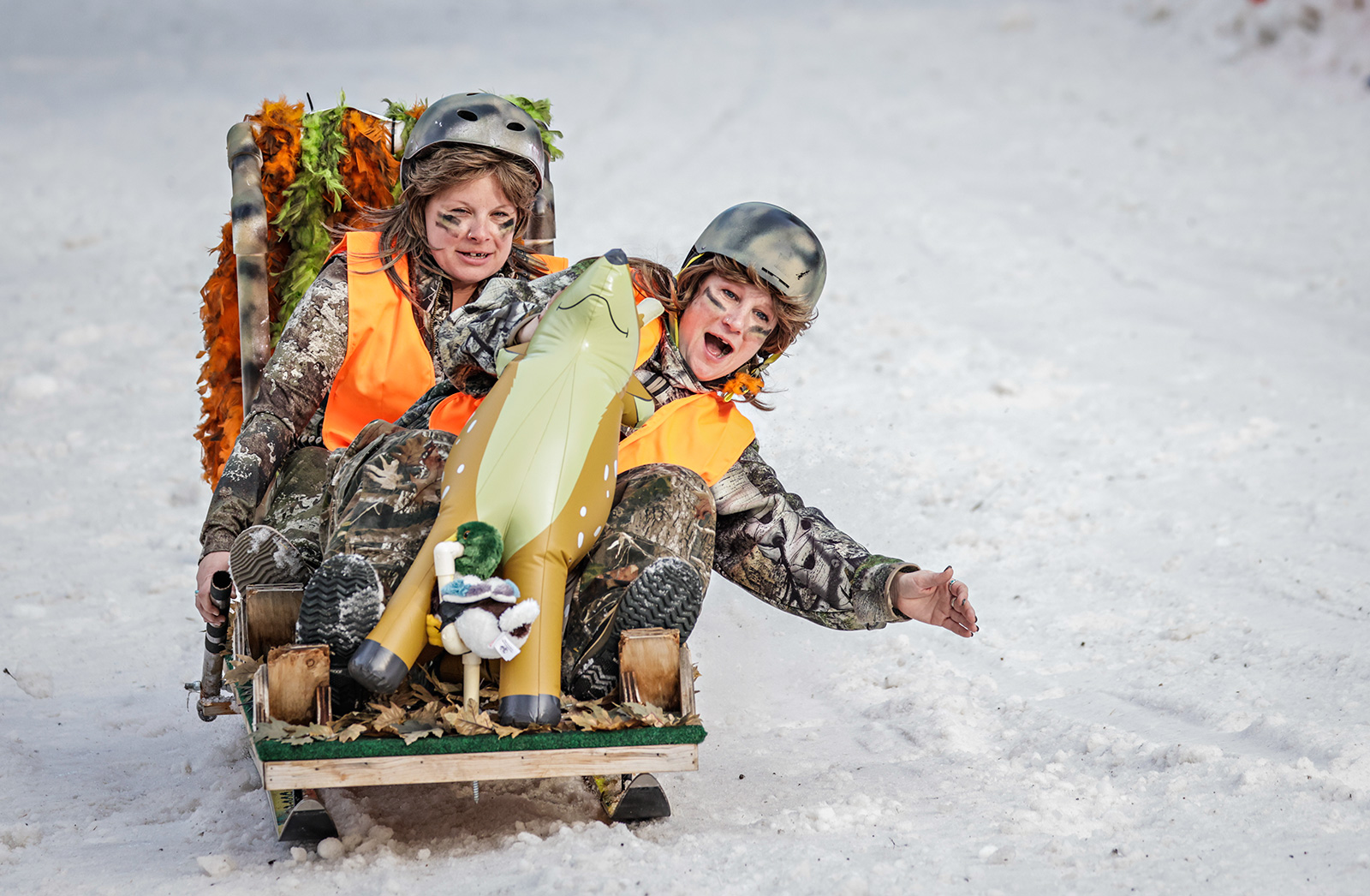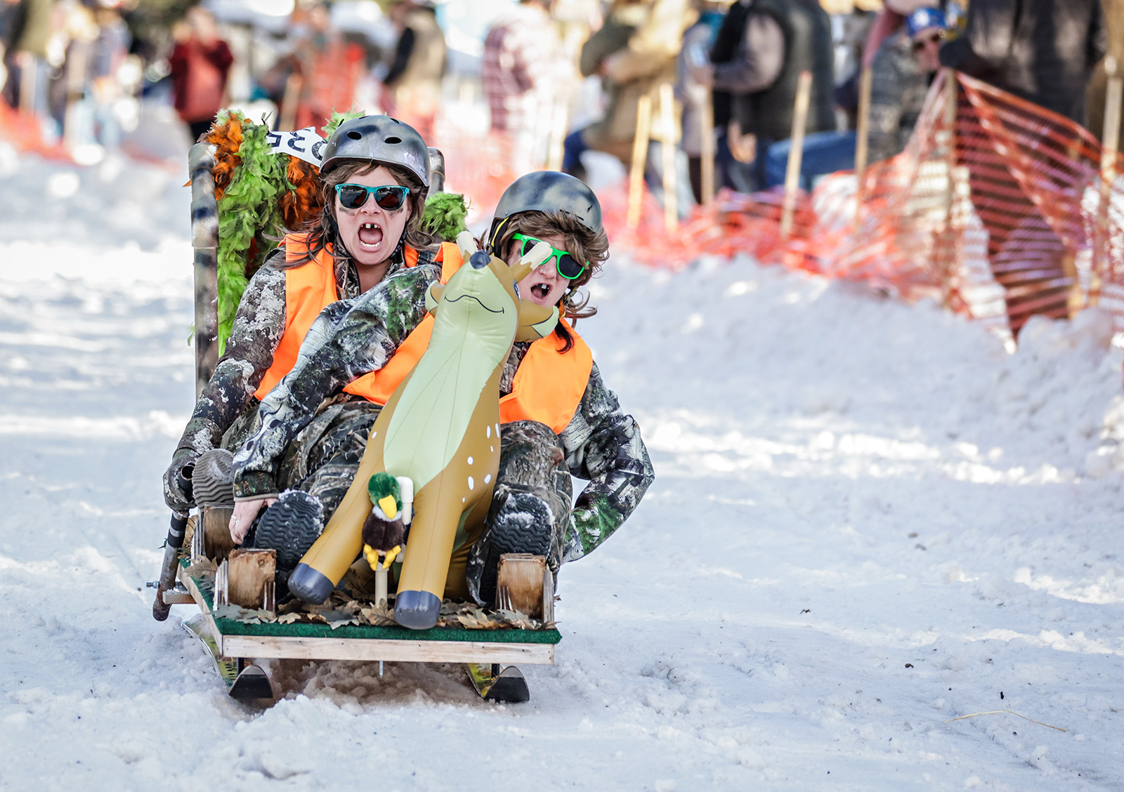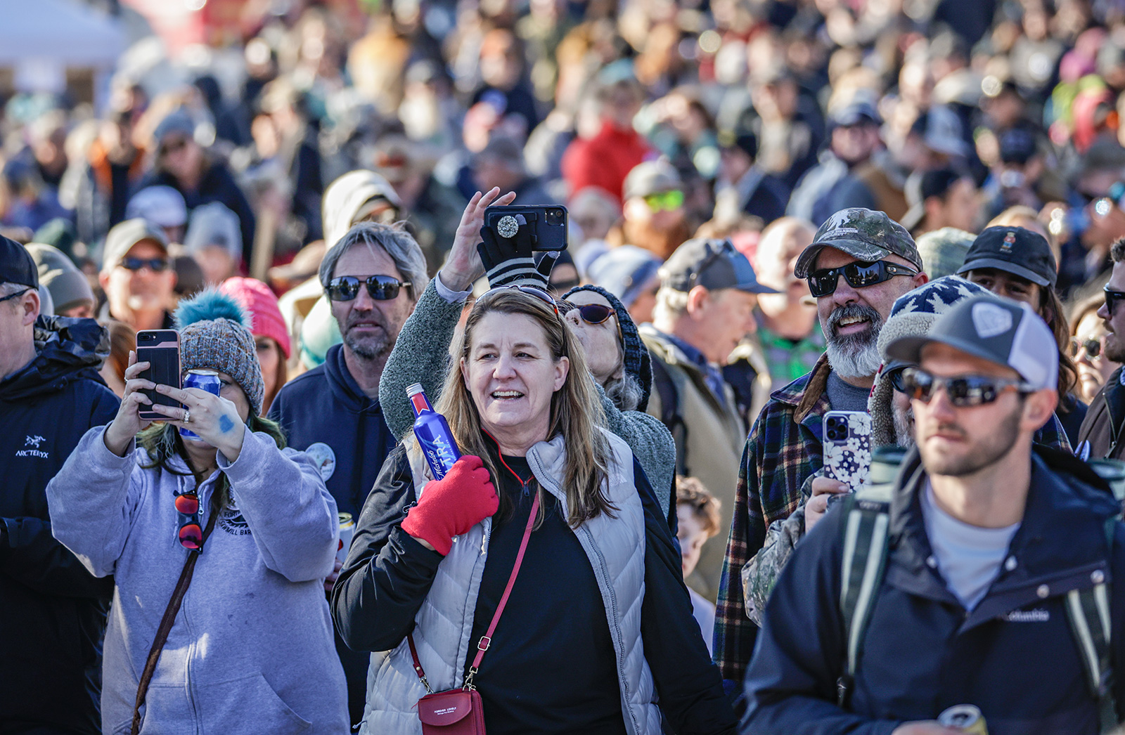 Beverage-toting throngs packed the slopes of Sugar Hill in Martin City to watch the 44th annual Cabin Fever Days Bar Stool Ski Races on Feb. 11, 2023.. Hunter D'Antuono | Flathead Beacon