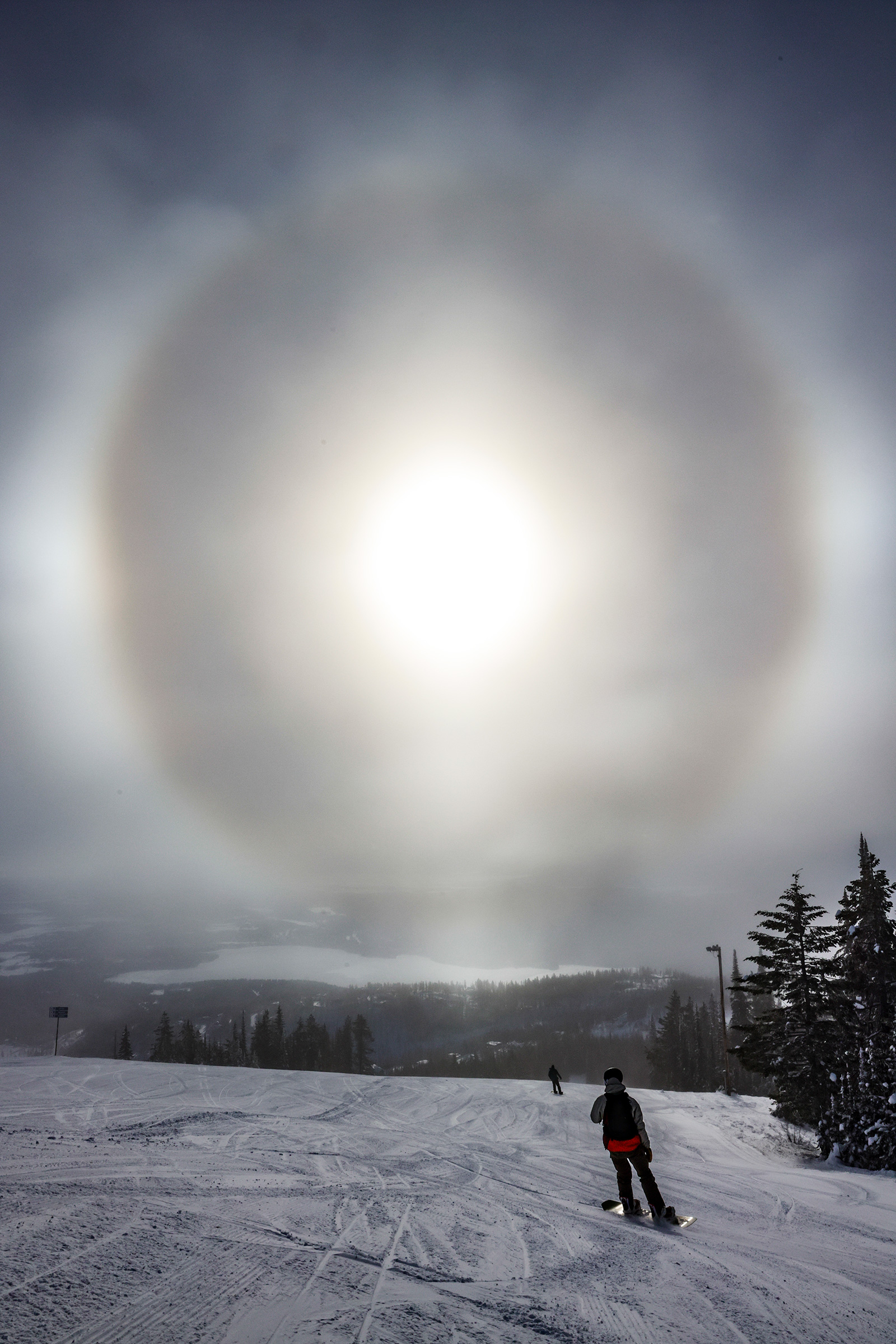 A halo with parhelia, also called sun dogs, caused by suspended ice crystals in the atmosphere, appears around the sun over Whitefish Mountain Resort on Dec. 22, 2022, where temperatures hovered around -15 in the afternoon. Hunter D’Antuono | Flathead Beacon