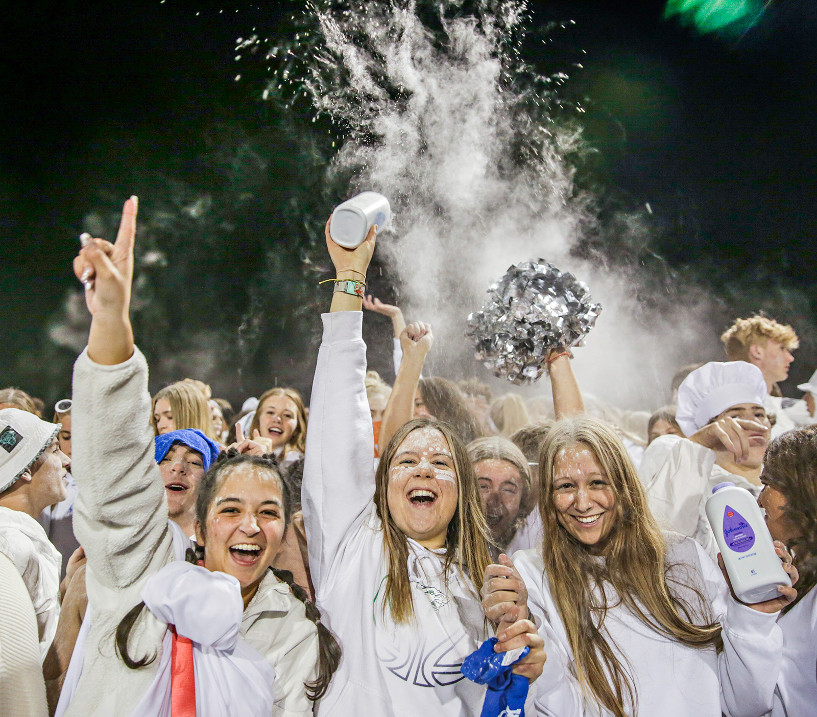 Glacier Wolfpack fans send up plumes of powder over the stands during the annual Crosstown football game against the Flathead Braves at Legends Stadium in Kalispell on Oct. 14, 2022. Glacier won 49-14. Hunter D’Antuono | Flathead Beacon