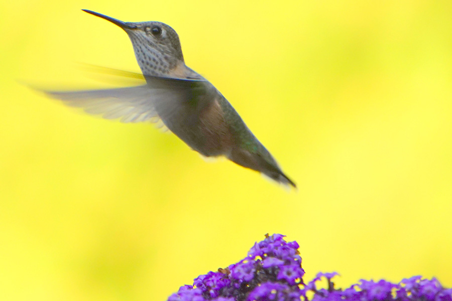 Young hummingbird on blue flower. Joe Decker