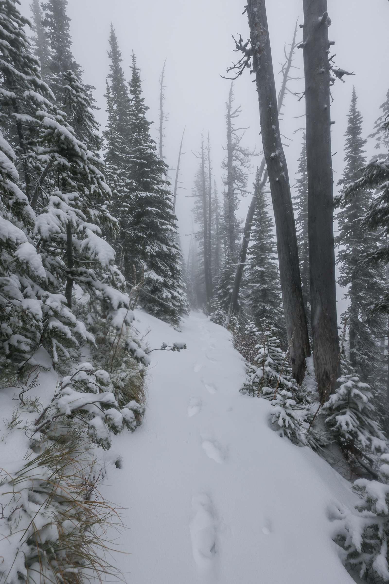 Alpine 7 Trail on a foggy and snowy day in the Swan Range on Nov. 23, 2025. Hunter D’Antuono | Flathead Beacon