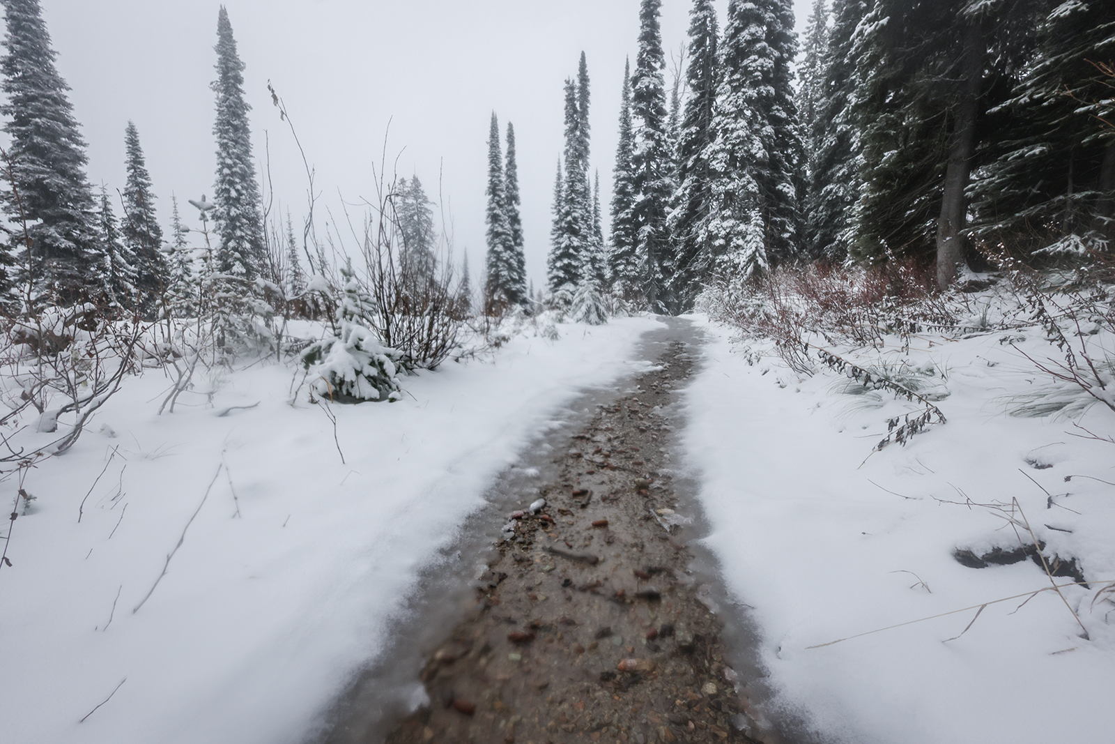 Snow covered trail on Ashley Mountain in the Flathead National Forest on Nov. 9, 2025. Hunter D’Antuono | Flathead Beacon