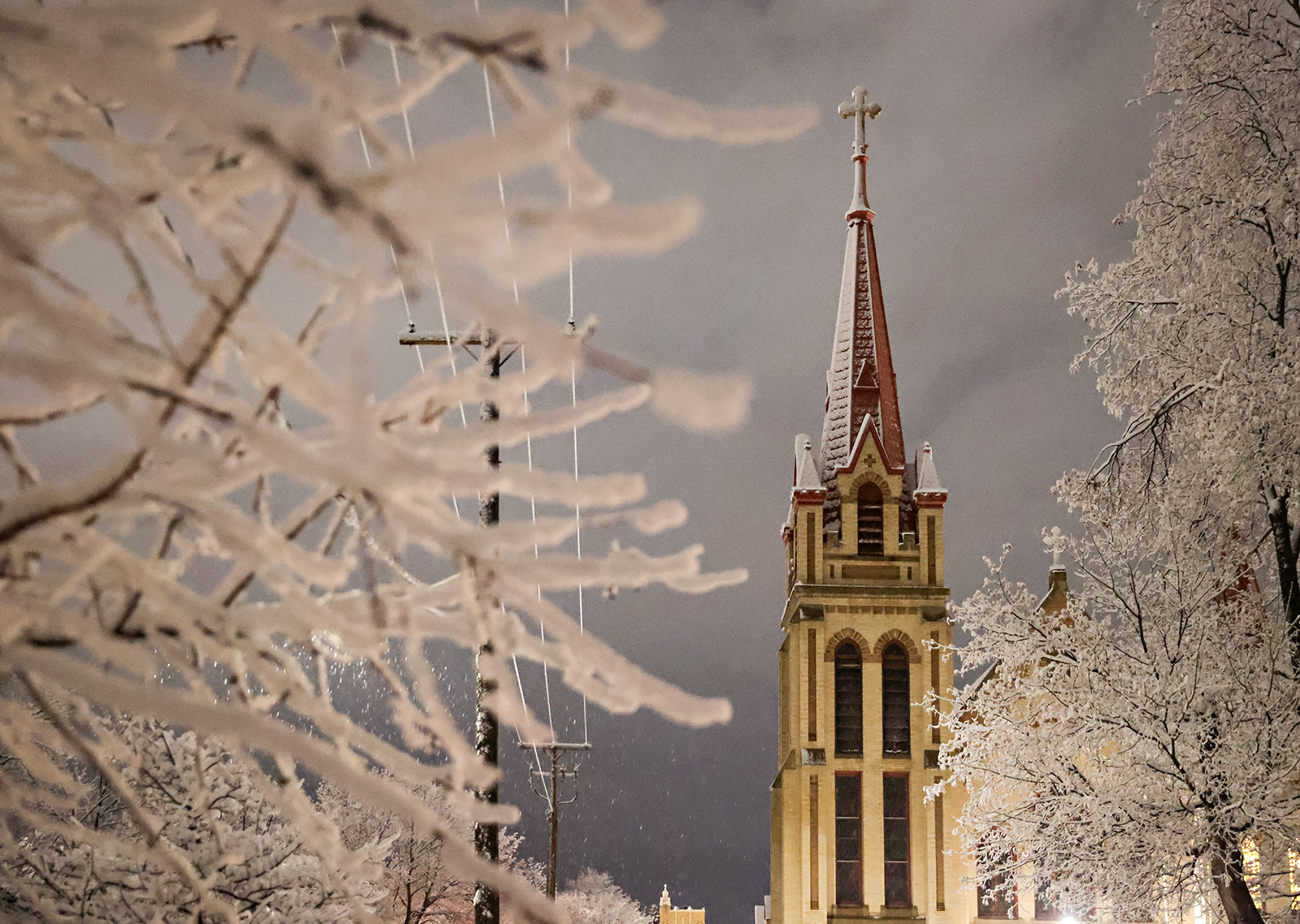 St. Matthew’s Catholic Parish in Kalispell by night after the first snowfall of the season on Nov. 24, 2025. Hunter D’Antuono | Flathead Beacon