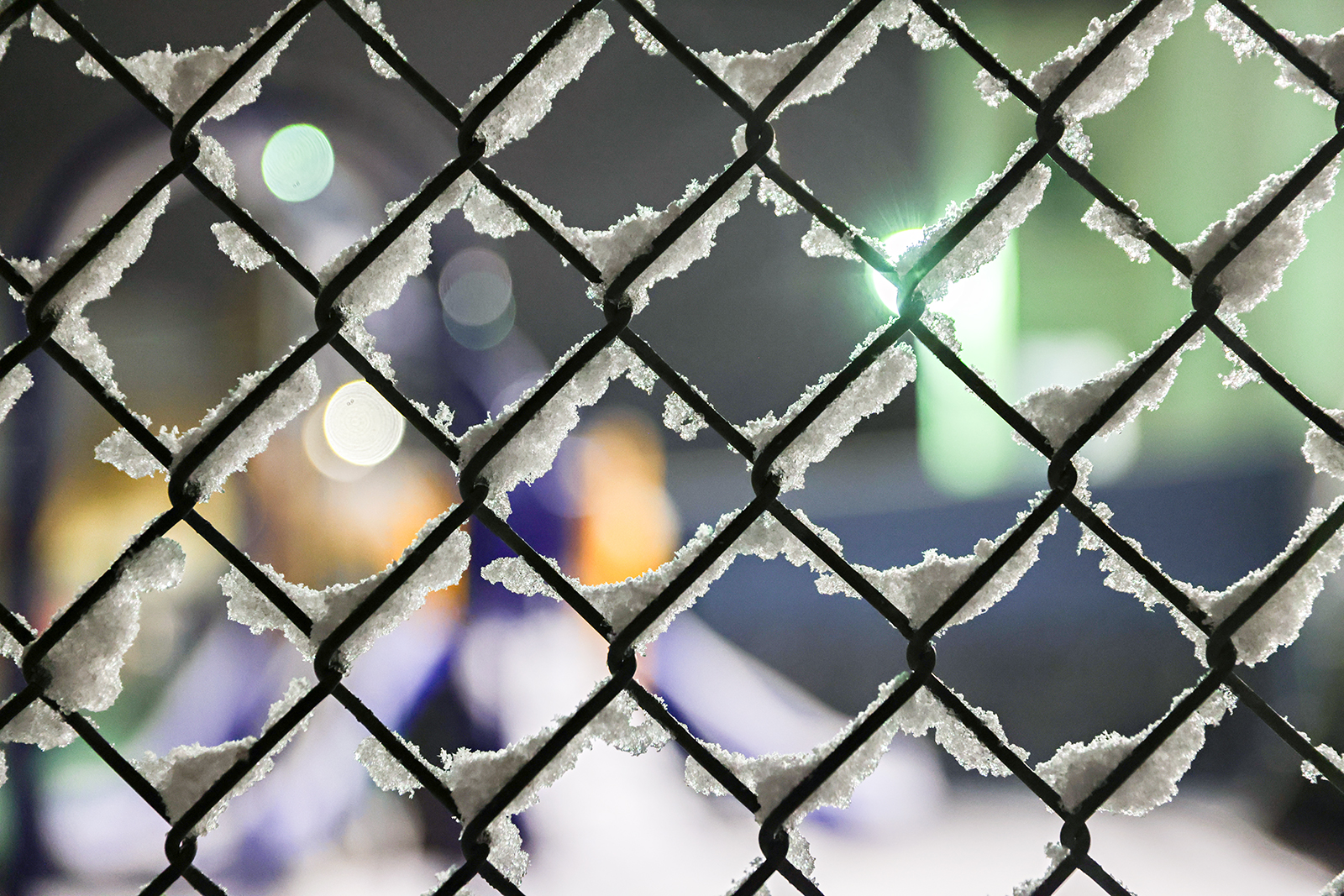A chainlink fence by night in Kalispell after the first notable snowfall of the season in the city on Nov. 24, 2025. Hunter D’Antuono | Flathead Beacon