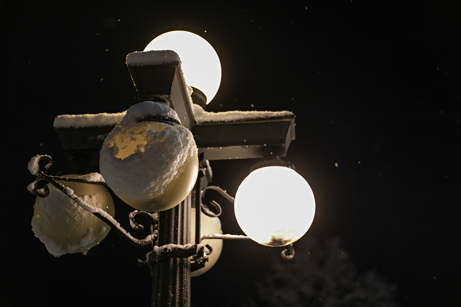 Street lamps in Kalispell during the first notable snowfall of the season on Nov. 24, 2025. Hunter D’Antuono | Flathead Beacon