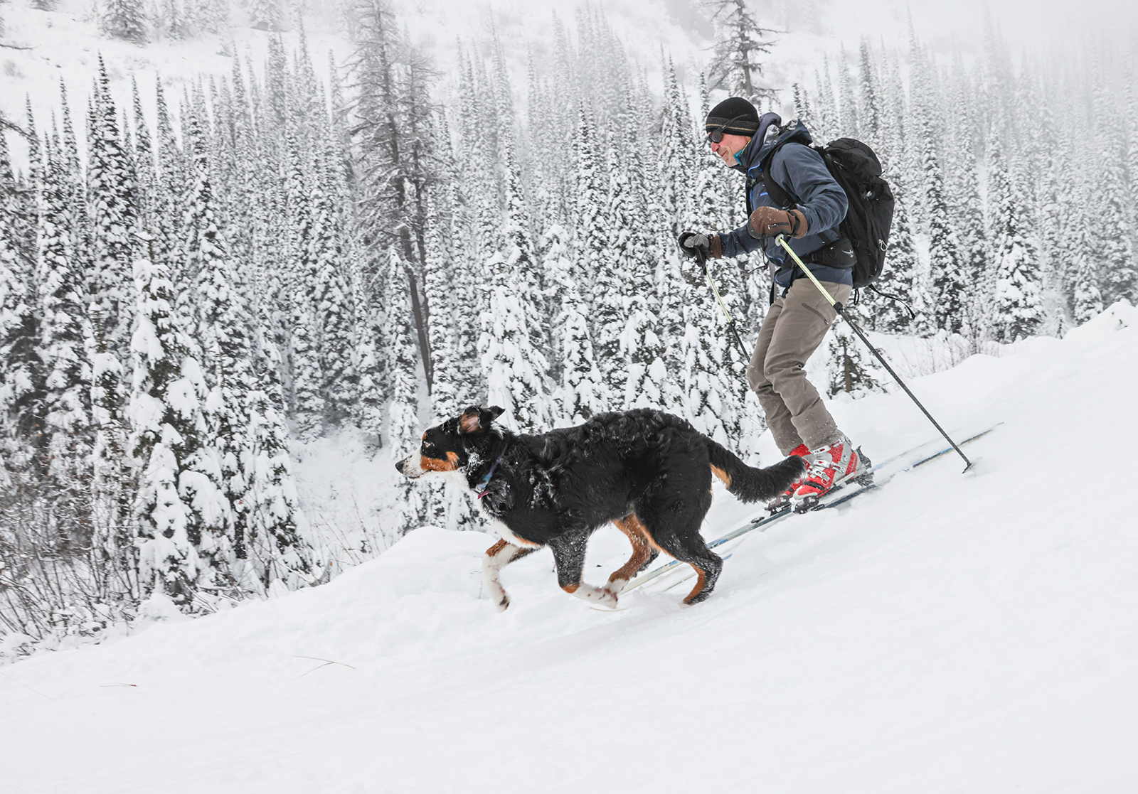 A skier and a dog descend Big Mountain at Whitefish Mountain Resort on Nov. 30, 2025. Hunter D’Antuono | Flathead Beacon