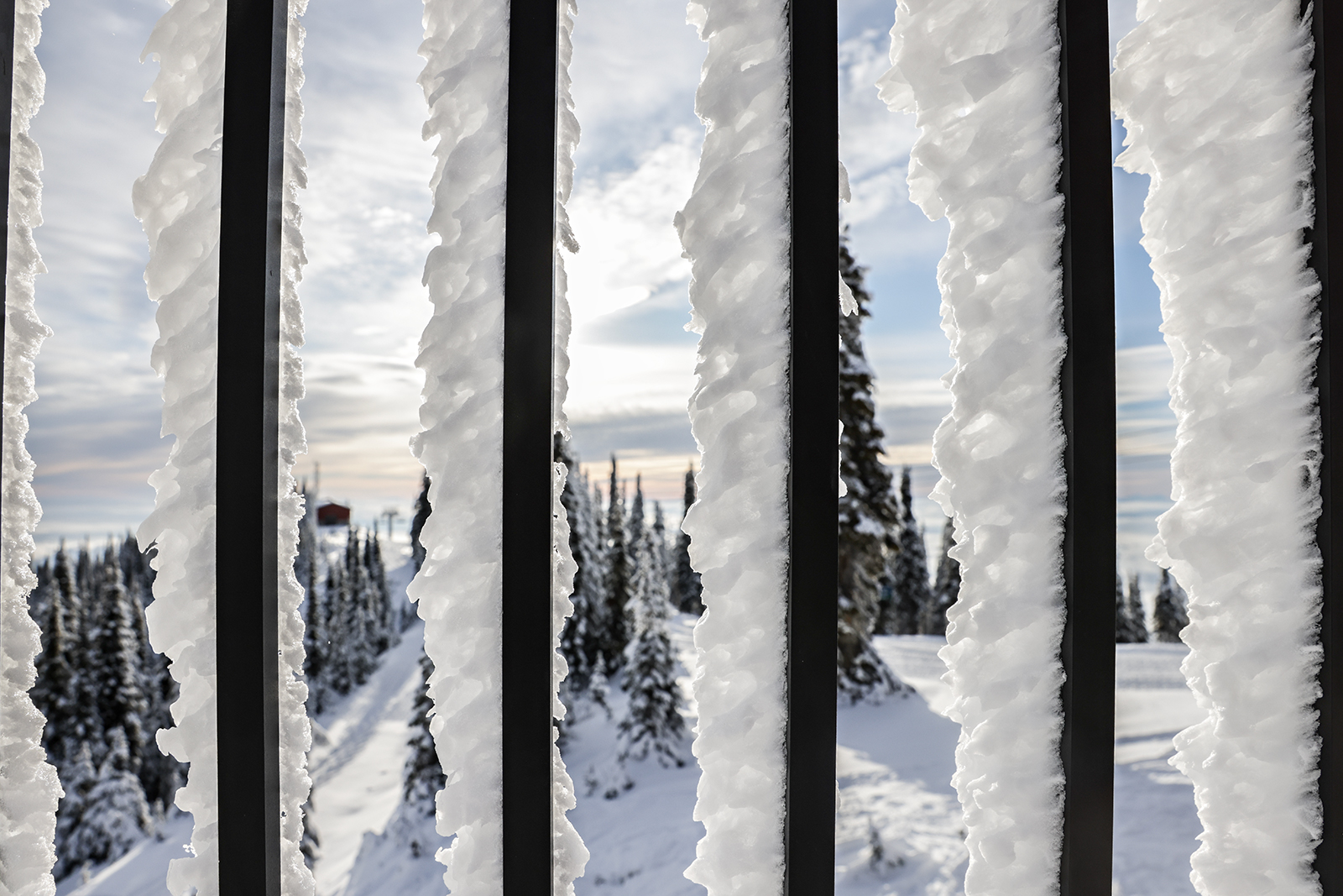 Accumulations of rime on the deck railing of the Summit House at Whitefish Mountain Resort on Nov. 30, 2025. Hunter D’Antuono | Flathead Beacon