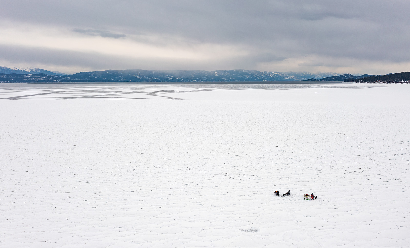 Mike Violette and Joe Senger ice fish in Somers Bay on Flathead Lake on March 5, 2023. Hunter D’Antuono | Flathead Beacon