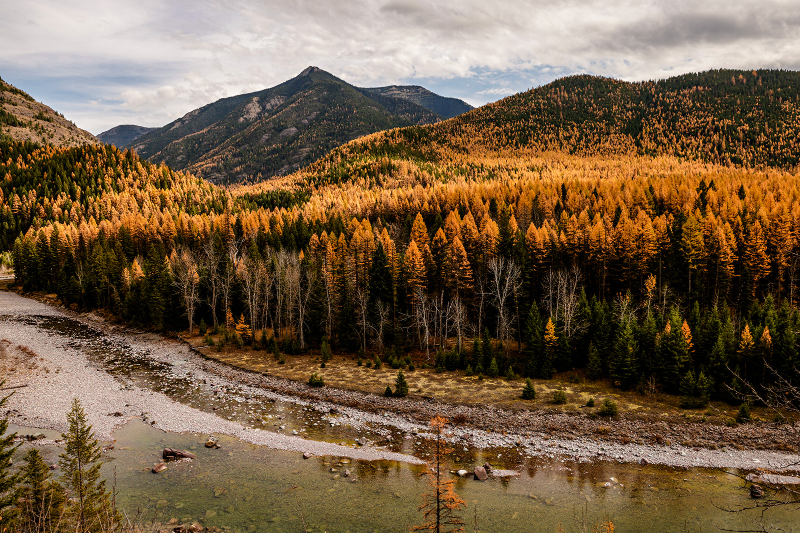 Autumnal larch infuse the forests with gold along the Middle Fork and the southern fringes of Glacier National Park on Oct. 22, 2023. Hunter D'Antuono | Flathead Beacon