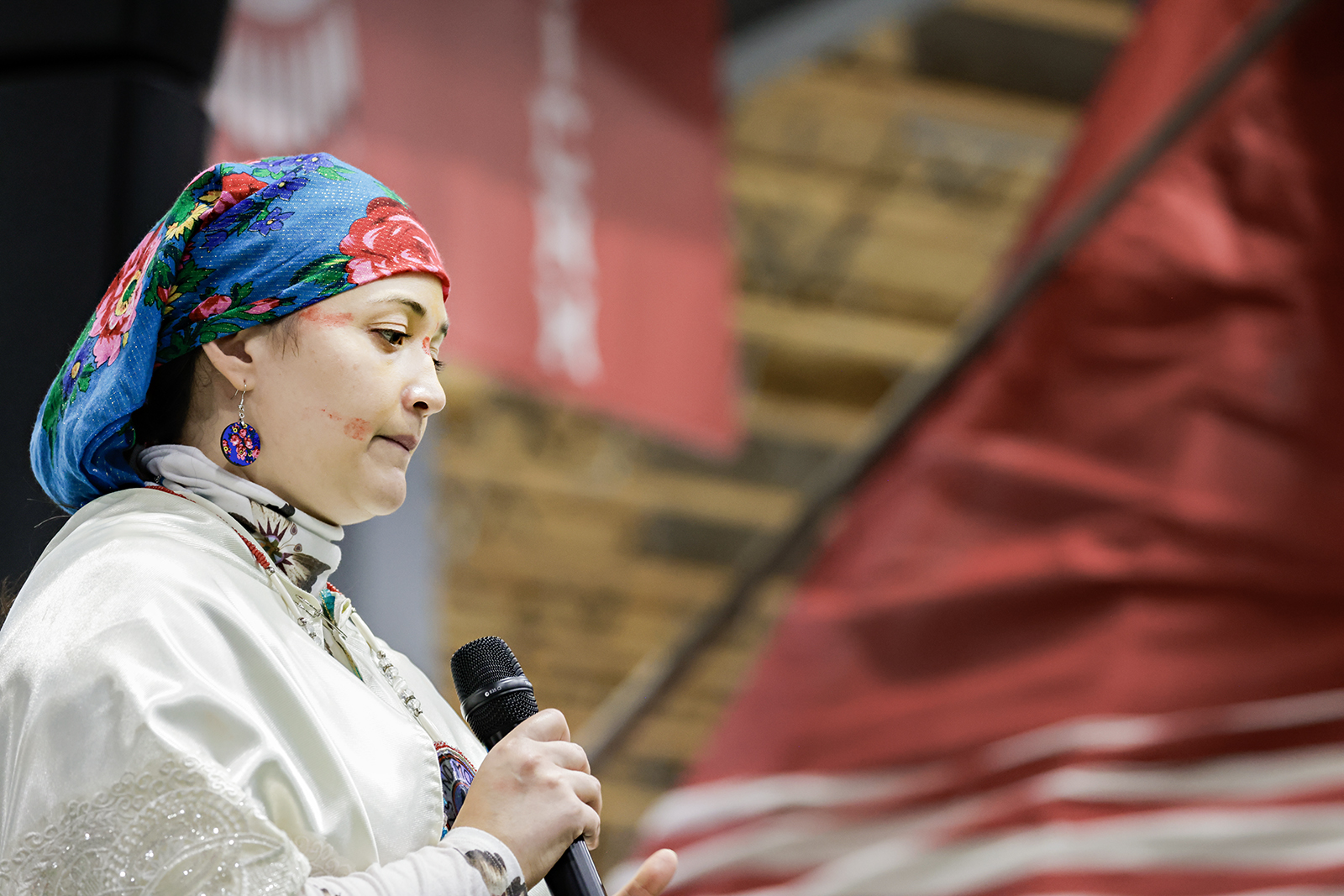 Master of Ceremonies Jesse DesRoiser speaks during a ceremony for actress Lily Gladstone, where she was honored with stand-up headdress in Browning on March 26, 2024. Hunter D’Antuono | Flathead Beacon