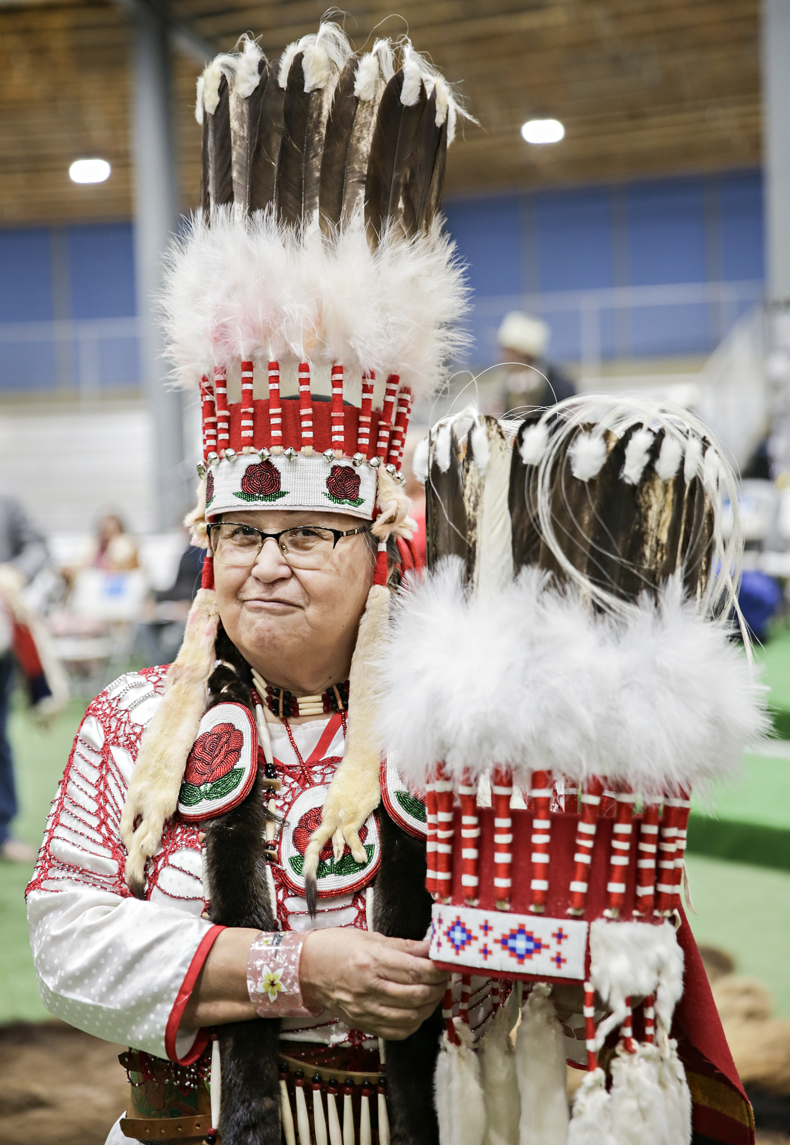 Charlene Plume, maker of the stand-up headdress presented to Lily Gladstone, holds the headdress ahead of a ceremony fro Gladstone in Browning on March 26, 2024. Hunter D’Antuono | Flathead Beacon