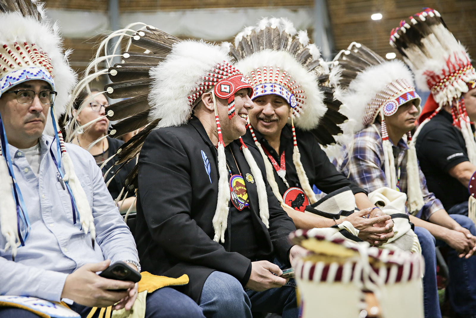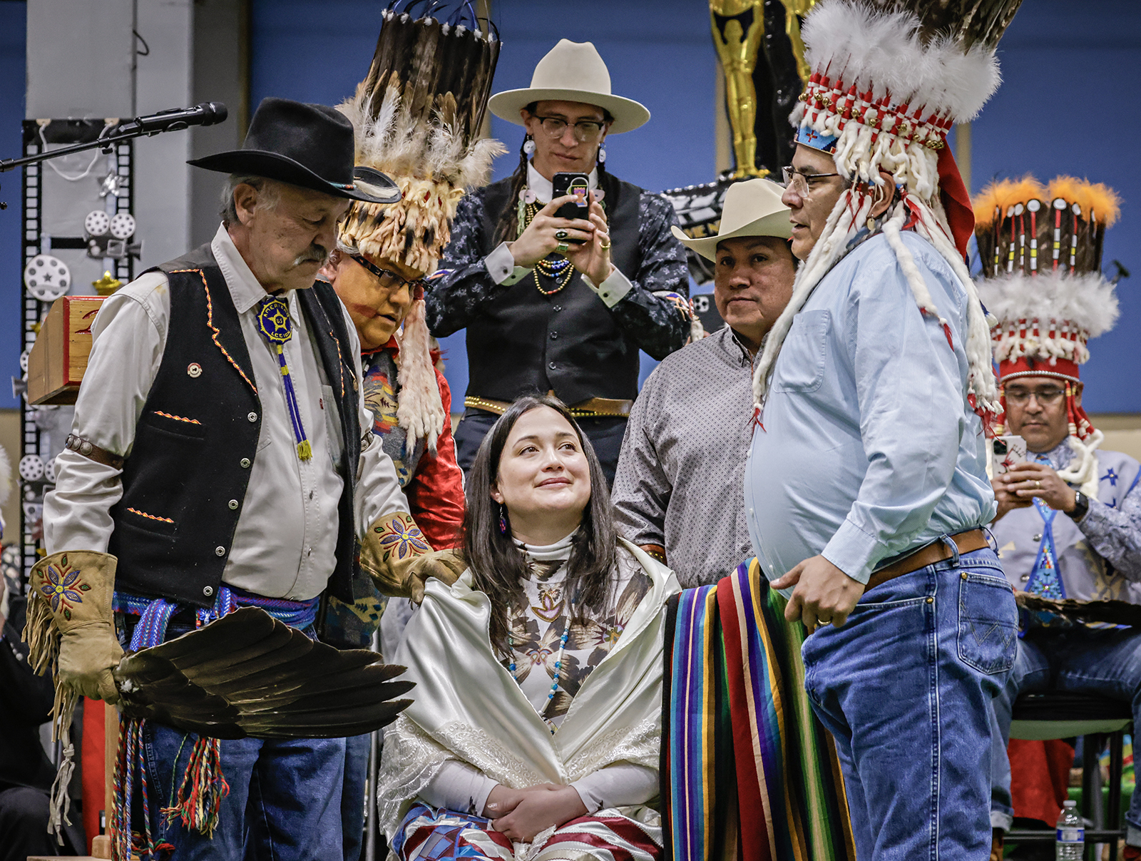 Leaders from various bands of the Blackfeet Nation gathered to honor Lily Gladstone with a ceremony in Browning on March 26, 2024. Hunter D’Antuono | Flathead Beacon