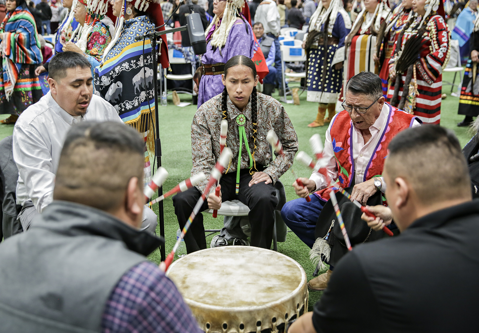 Drummers perform during a ceremony to honor Lily Gladstone in Browning on March 26, 2024. Hunter D’Antuono | Flathead Beacon