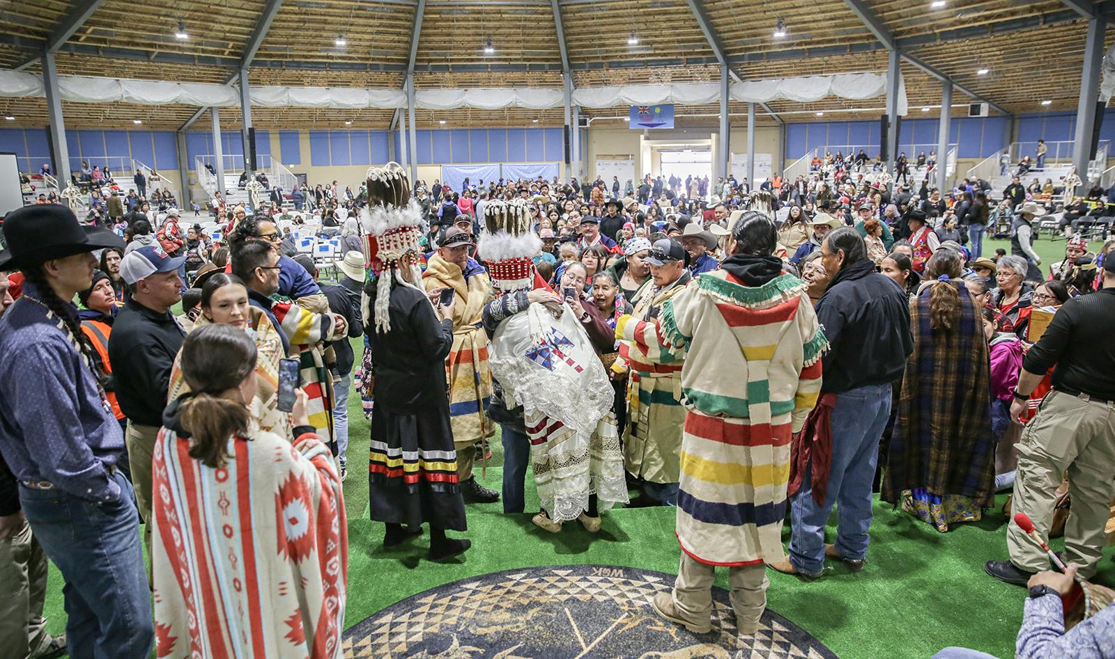 Members of the Blackfeet Nation gather to honor actress Lily Gladstone with a standup headdress ceremony in Browning on March 26, 2024. Hunter D’Antuono | Flathead Beacon