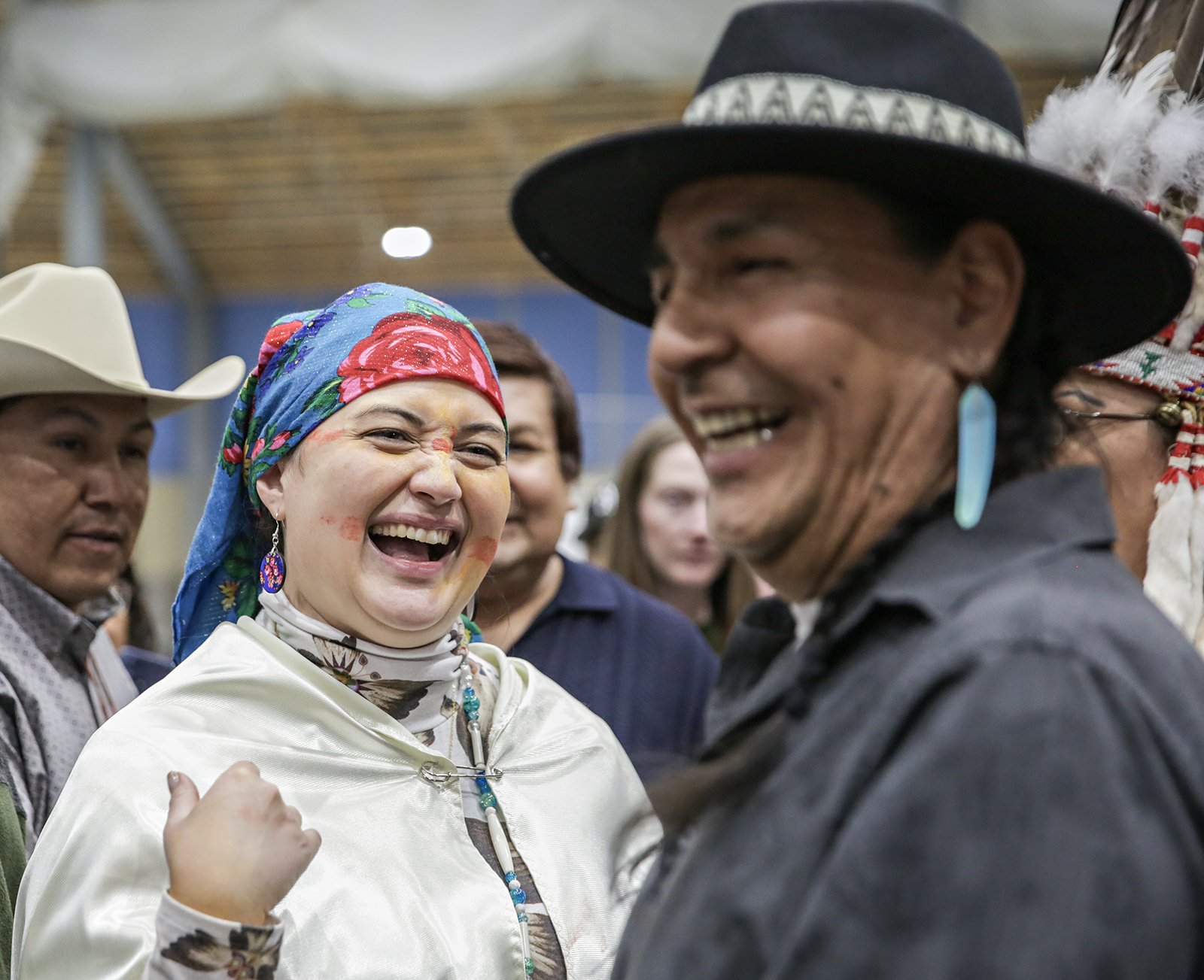 Lily Gladstone shares laughs as she greets her fellow Blackfeet tribal members during a ceremony in her honor in Browning on March 26, 2024. Hunter D’Antuono | Flathead Beacon