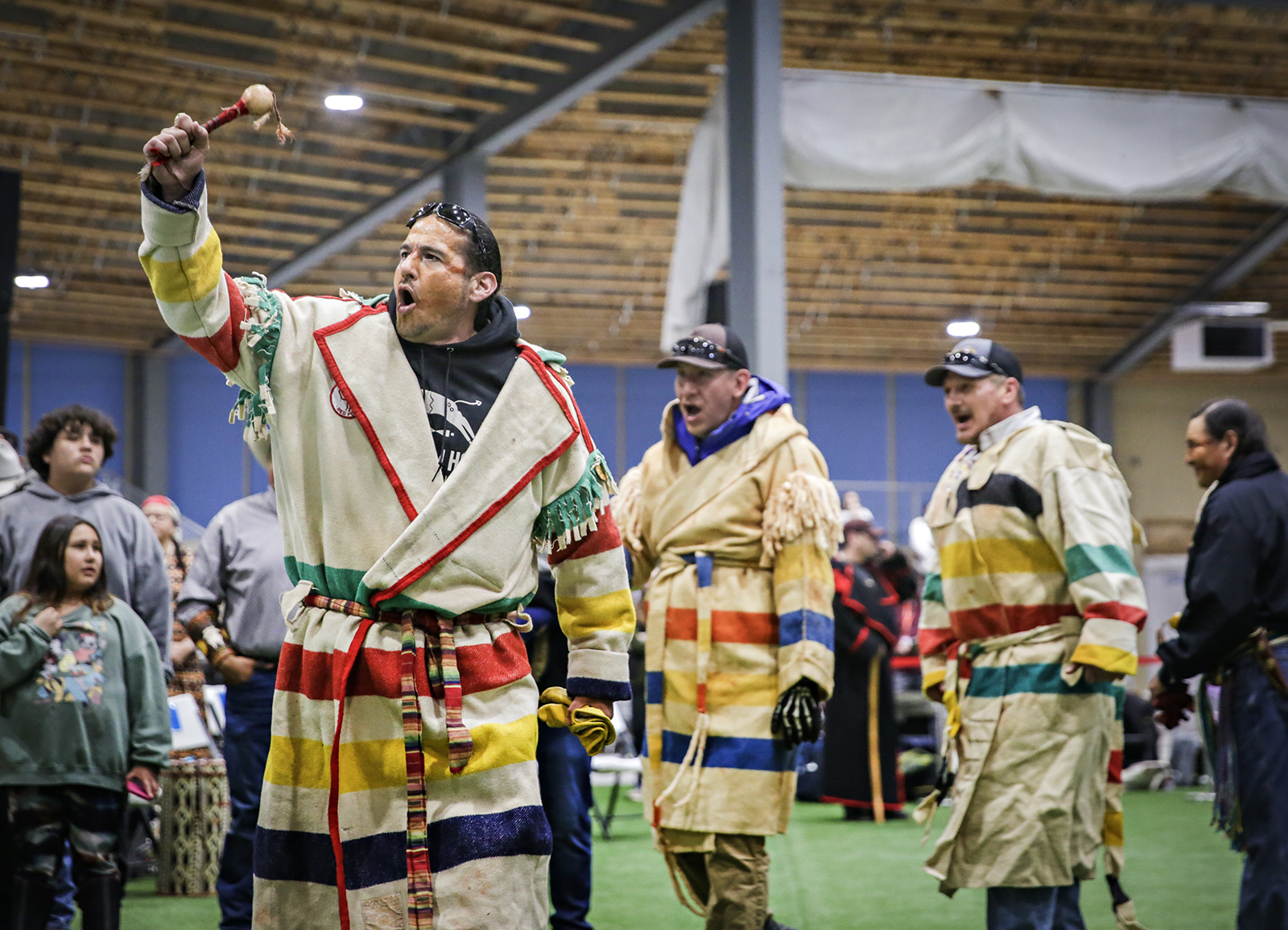 William Gladstone, second cousin to Lily Gladstone, leads a victory dance in Lily’s honor during a ceremony for her accomplishments as an actress, in Browning on March 26, 2024. Hunter D’Antuono | Flathead Beacon