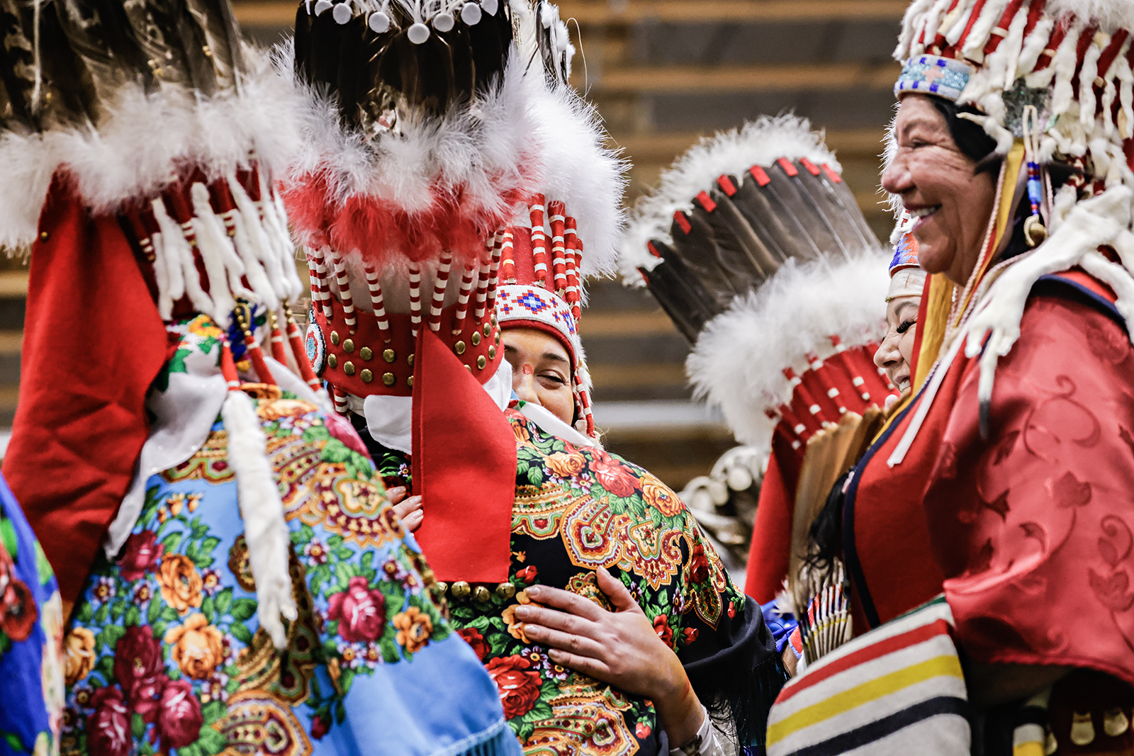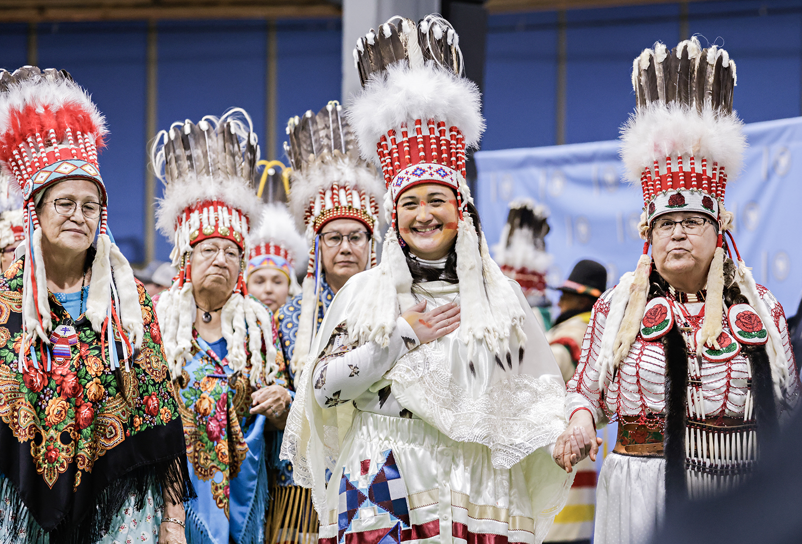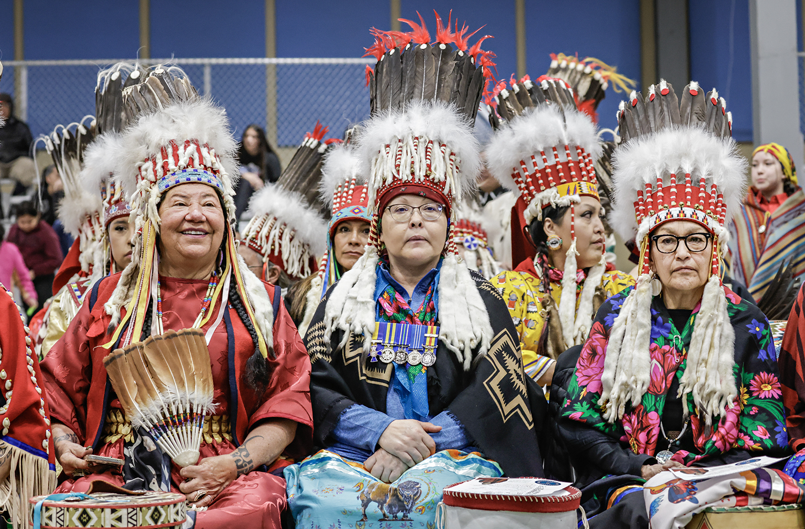 Members of the Blackfeet Women’s Stand Up Headdress Society gather for a ceremony for actress Lily Gladstone in Browning on March 26, 2024. Hunter D’Antuono | Flathead Beacon