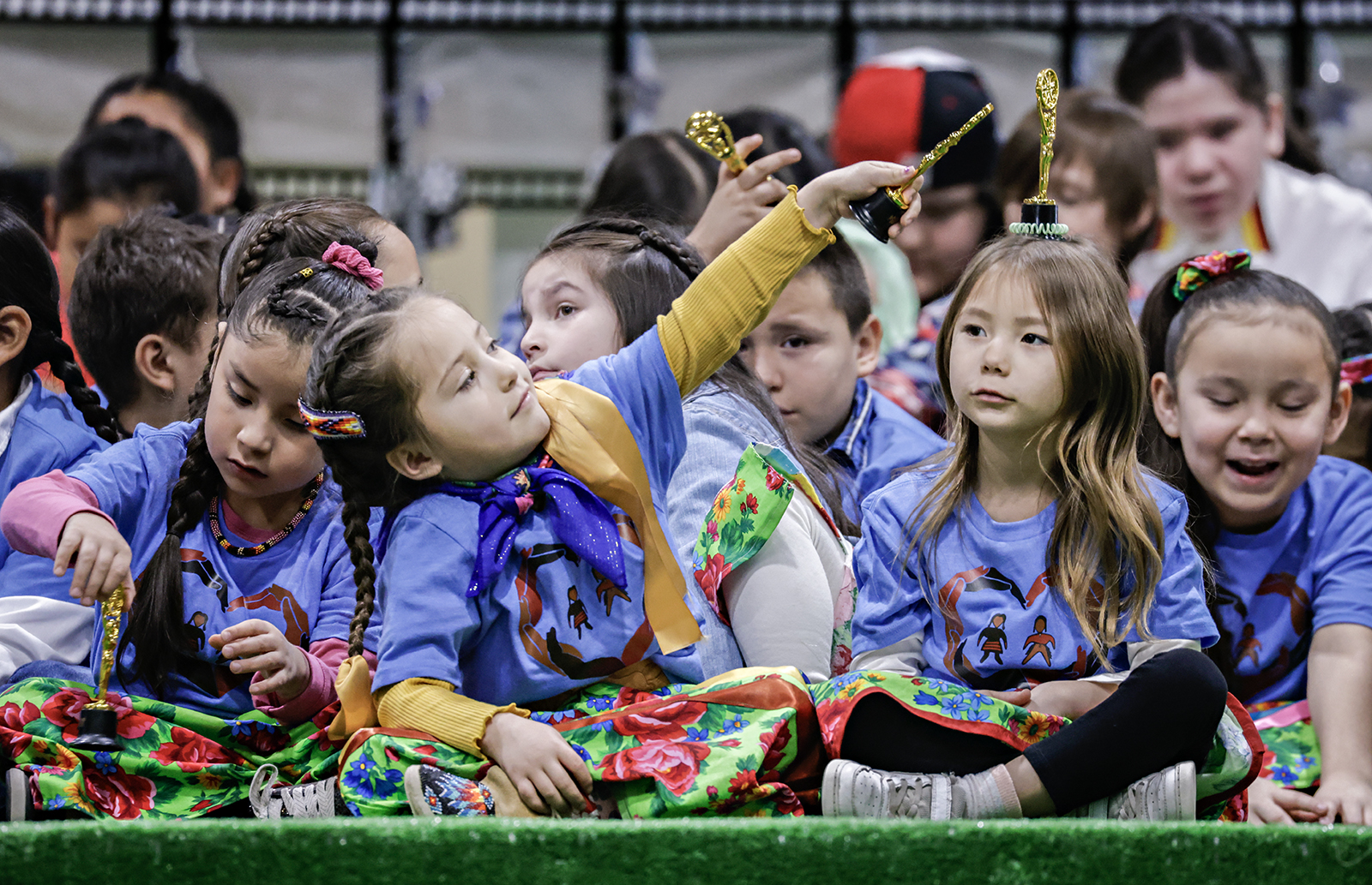 Blackfeet school children play with miniature movie award statues during a ceremony to honor actress Lily Gladstone in Browning on March 26, 2024. Hunter D’Antuono | Flathead Beacon